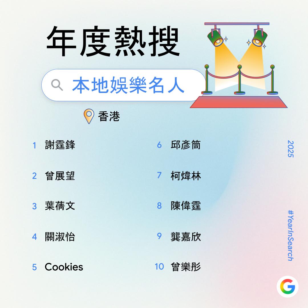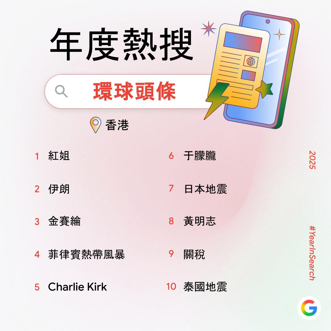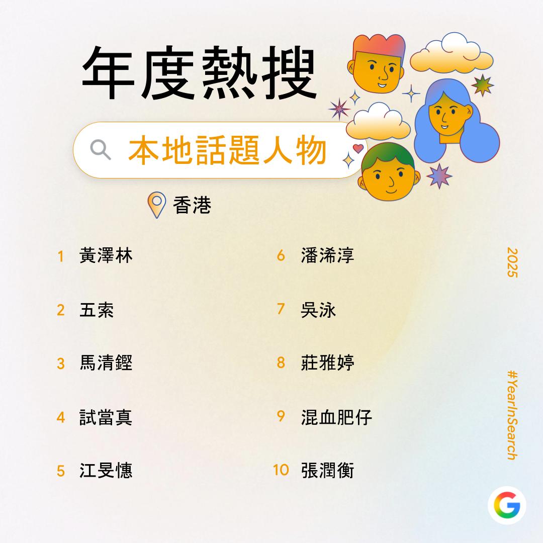 大公文匯全媒體報道,過去一年,你在網上搜索了什麼?Google香港今日(6日)公布2025年度搜尋榜,彙整去年搜尋量飆升得最高的關鍵字,透過數據回顧2025年港人關注的話題。搜尋榜共有14份榜單,涵蓋詞彙、時事、人物、娛樂及休閒範疇。