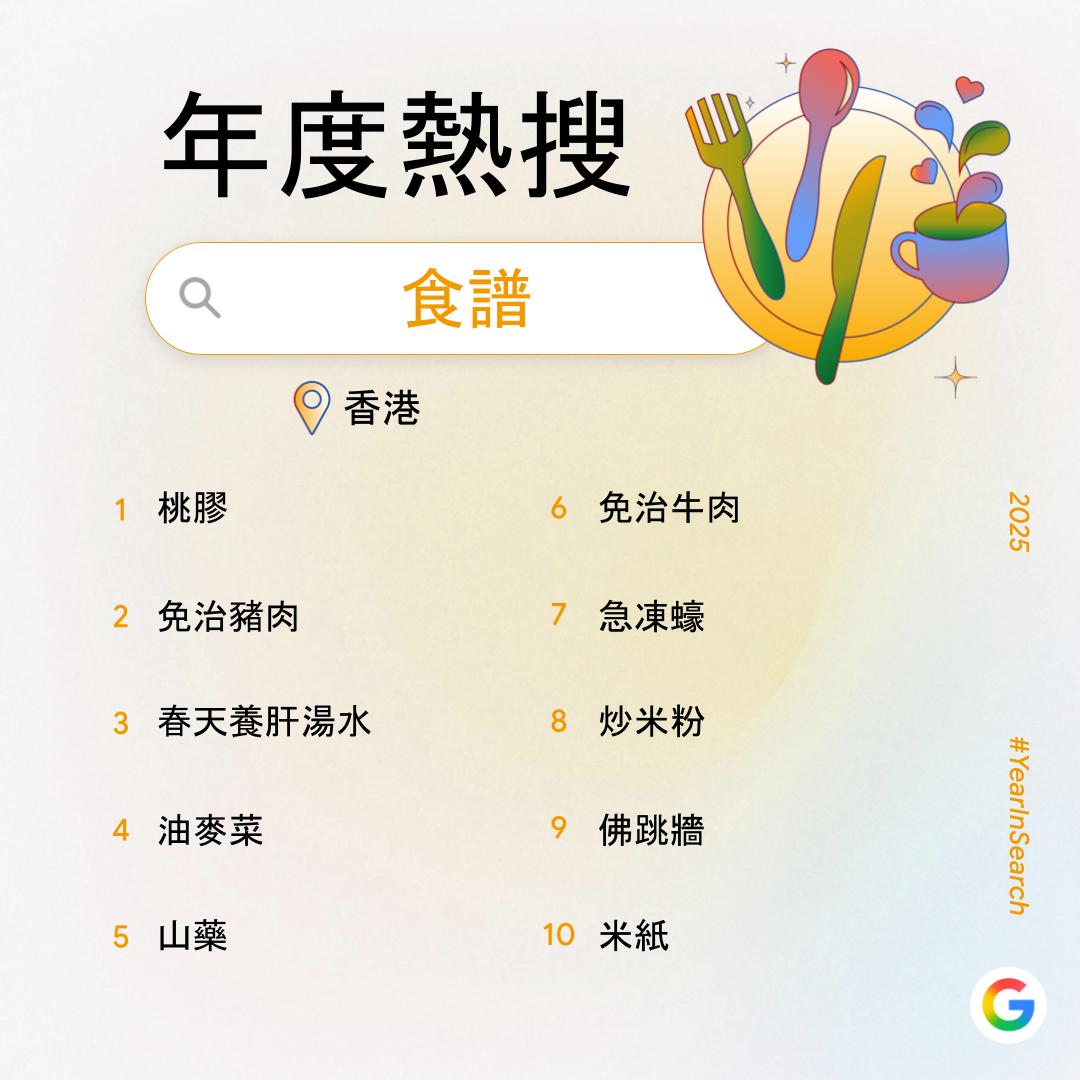 十大「熱搜食譜」由「桃膠」位居榜首。值得留意的是,位列第三的「春天養肝湯水」反映了港人搜尋習慣的轉變:用戶傾向在單次搜尋中輸入多於一項條件(如食譜功效及食物類別),以更精準、更有效率地找到想要的食譜。