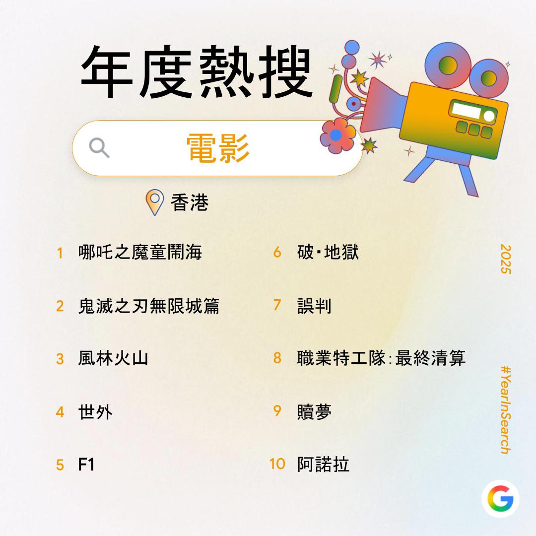 「熱搜關鍵字」第十位「哪吒之魔童鬧海」同時登上「熱搜電影」第一位,十大「熱搜電影」中,港產片佔五席,包括城中話題作「風林火山」及香港原創動畫「世外」。「熱搜劇集及節目」則由「新聞女王2」膺榜首。