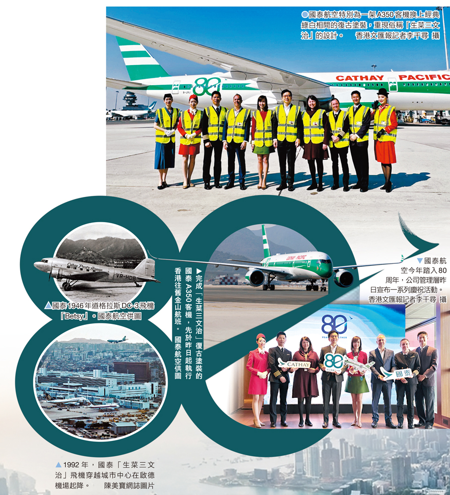 (香港文匯報 記者 李千尋)1925年的大年初一,當時尚未建成機場的啟德首次有正式飛行紀錄,標誌着香港航空史的起點;百年以來,香港一直是全球重要的國際航空中心,航空業亦見證城市發展歷程。在香港致力推動航空超級樞紐發展之際,本地多年來最主要航空公司國泰航空今年踏入80周年,並宣布展開一系列發展計劃與慶祝活動,其中包括將投資逾1,000億元以提升顧客體驗,並進一步拓展航線網絡,以支持香港藉航空業持續加強與全球聯繫。另國泰特別為兩架飛機換上經典綠白相間的復古塗裝,重現俗稱「生菜三文治」的機身設計,並安排逾千名員工穿上懷舊制服,向社會大眾展示此香港老品牌的歷史演變。