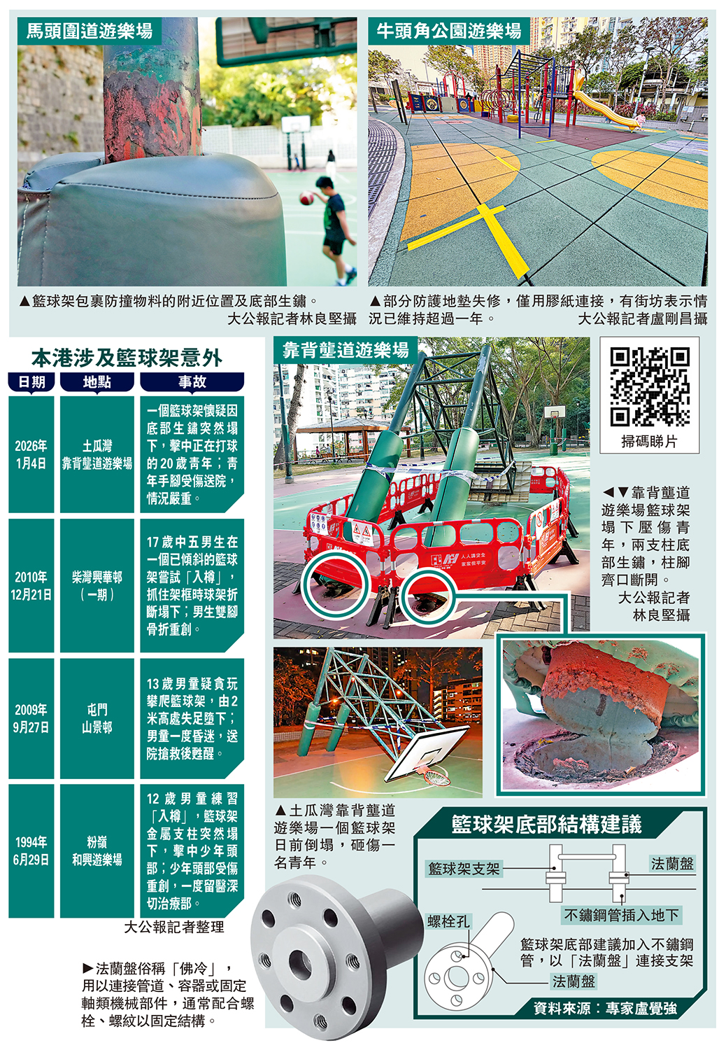 (大公報 記者 賴振雄)土瓜灣靠背壟道遊樂場日前(4日)發生罕見意外,一個籃球架疑結構生鏽老化倒塌,壓中一名20歲青年,導致他頭及膝部受傷,情況嚴重。大公報記者在意外發生後,到多個遊樂場了解籃球架情況,發現多個籃球架的支架頂部一般情況良好,但接近防撞物料位置及底部明顯出現生鏽。
