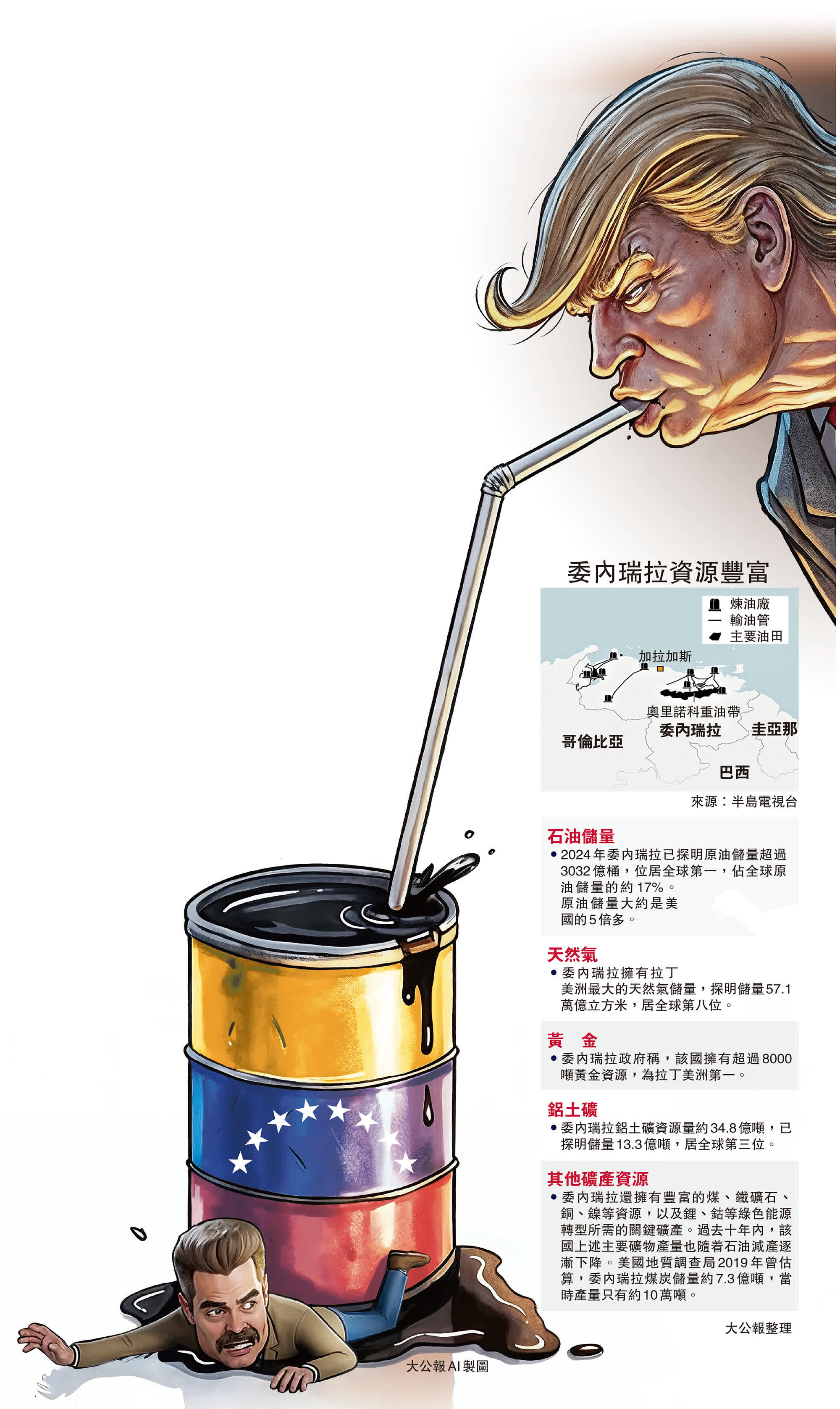 大公報綜合報道,美媒5日爆料,近日有大批美軍飛機突然飛往歐洲,推測或是為了攔截此前駛往委內瑞拉的「貝拉1」號油輪。美國3日悍然入侵委內瑞拉,其目的之一就是該國豐富的資源。美國總統特朗普揚言,要控制委內瑞拉石油產業,聲稱美國石油企業已做好在委大舉投資的準備,以恢復委石油出口。分析指,委內瑞拉的「重油」更符合美國現有石油產業鏈的需求,在美國市場具有極強的互補性。
