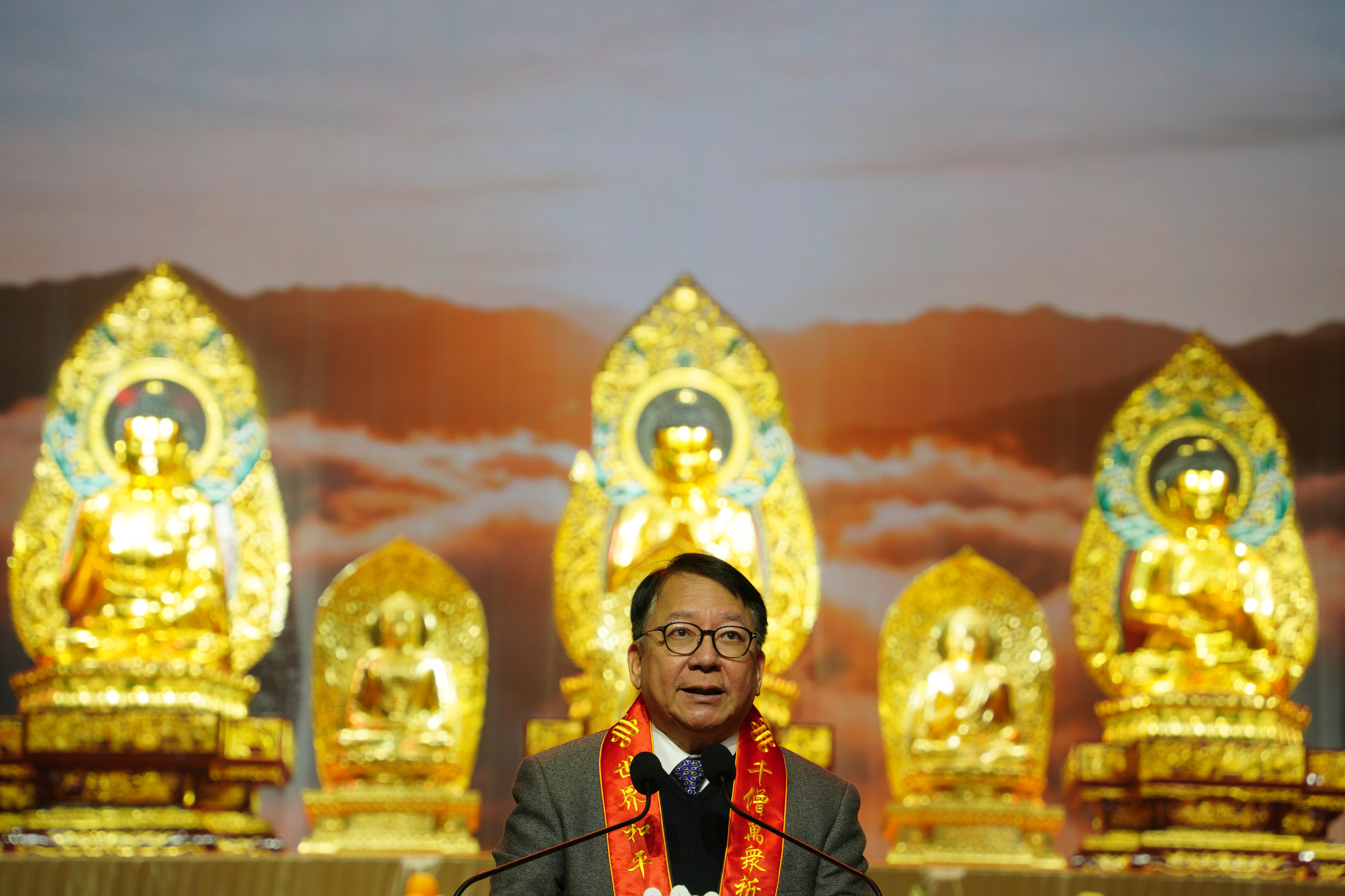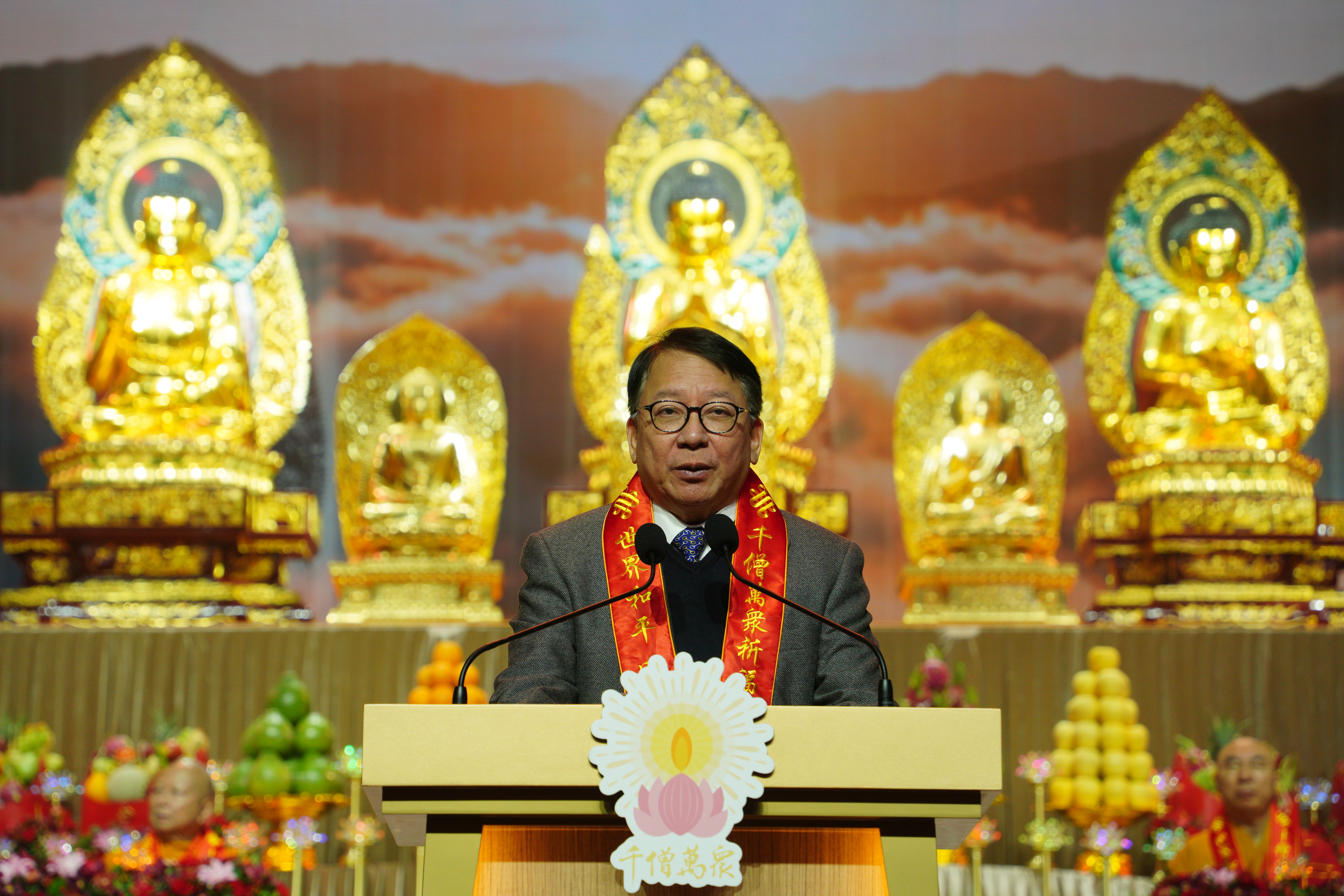 主禮嘉賓政務司司長陳國基致辭表示,佛教是中華傳統文化重要組成部分,其倡導的慈悲、平等等思想,詮釋了中華文化和而不同、有容乃大的精神梗概。他續指,香港植根於優秀傳統文化,向來對不同宗教及文化兼容並蓄,形成開放包容的社會氛圍,為其成為中華文化薈萃之地及國際大都會提供重要根基。