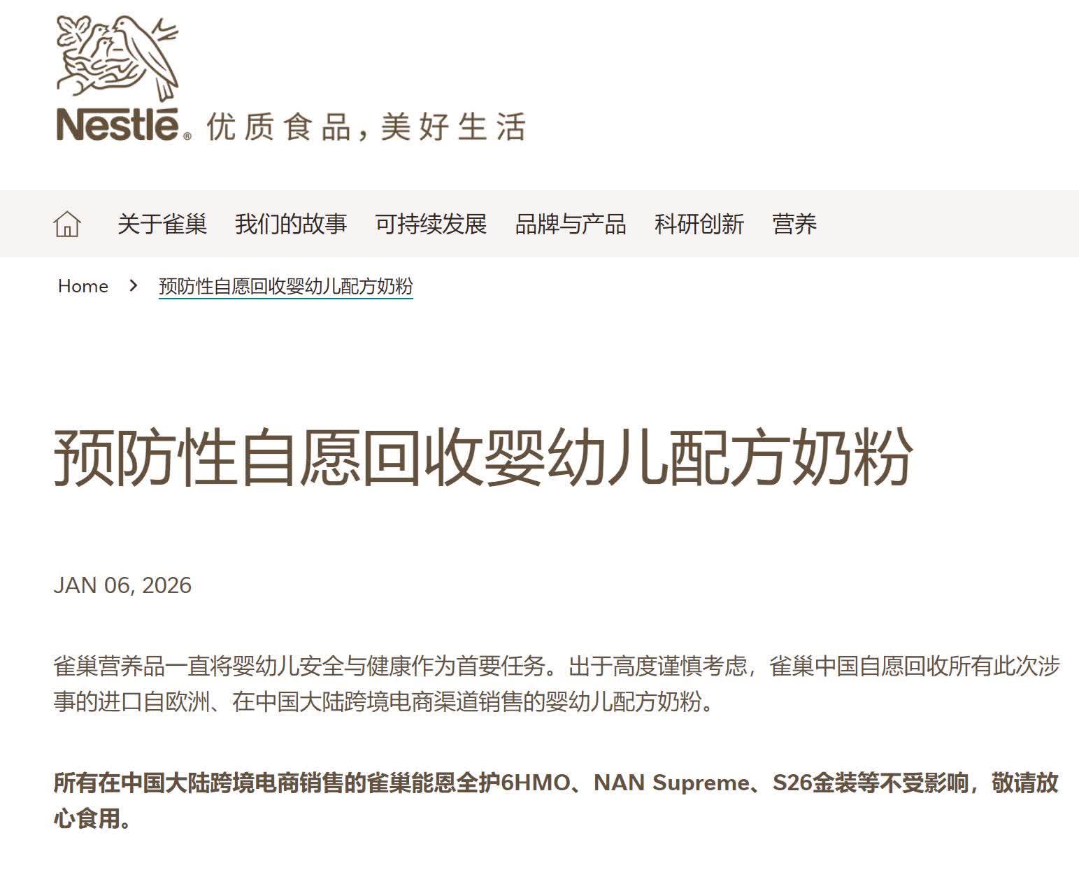 7日,雀巢中國方面回應中新經緯稱,雀巢歐洲部分市場對嬰幼兒配方奶粉產品啟動了預防性回收措施,雀巢中國對此高度重視,中國市場少數產品可能受到影響。作為預防性舉措,已經對部分特定批次的嬰幼兒配方奶粉進行了回收。截至目前,尚未收到與相關產品有關的任何不適報告。所有在中國大陸市場註冊並銷售的雀巢特殊醫學用途嬰兒配方食品、超啟能恩、啟賦、S26鉑臻等不受影響。