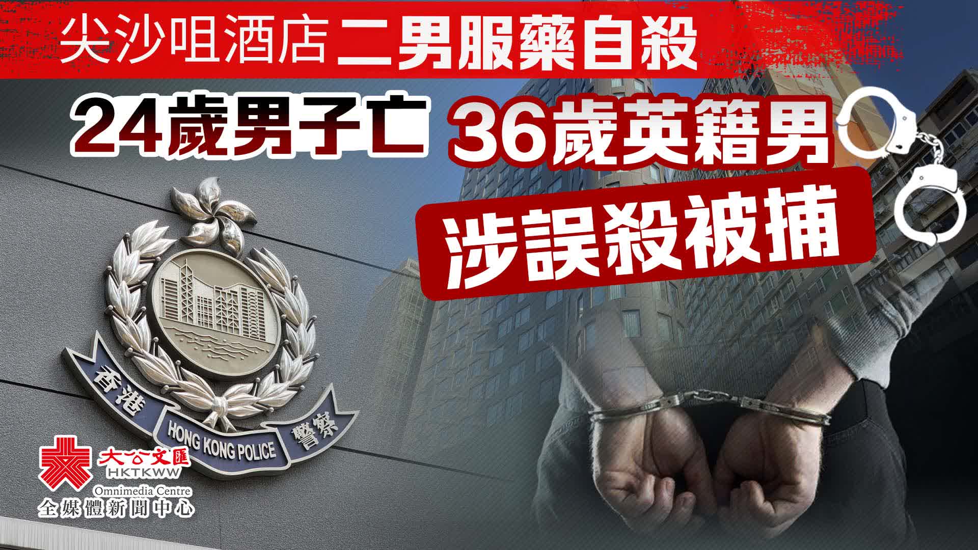 大公文匯全媒體報道,警方今日表示,已於昨日(6日)將上周五(2日)在尖沙咀發生的一宗送院時死亡案改列「誤殺」案。1月2日下午3時54分,警方接獲報案,指一名英籍男子向朋友表示企圖自殺。人員到場後,在彌敦道一酒店走廊發現一名36歲英籍男子倒臥在地,並在同一酒店房間內發現另一名24歲男子昏迷。兩人隨即被送往伊利沙伯醫院救治,24歲男子於當晚7時26分證實死亡。警方在現場檢獲約6克懷疑冰毒及一些吸食工具等。據了解,二人為同性情侶關係。