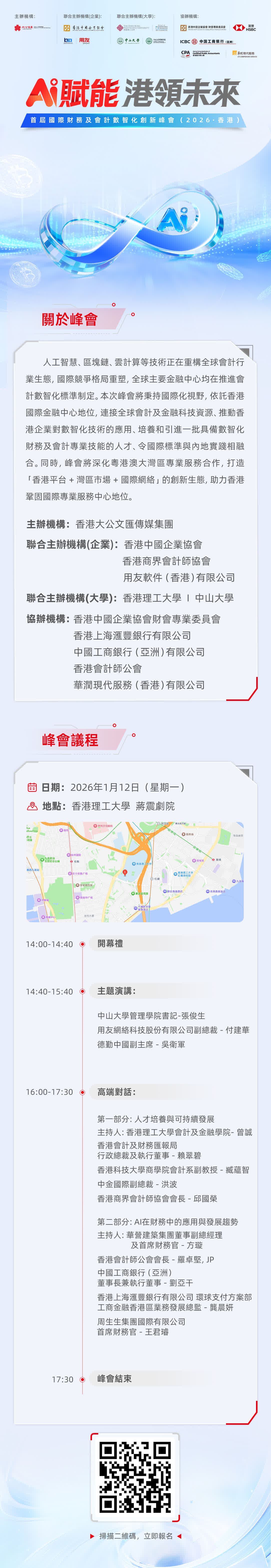 本次峰會立足香港國際金融中心的核心優勢,以國際化視野連結全球會計與金融科技資源,不僅將推動香港企業加速數智化技術落地應用,更將聚焦數智化財務會計人才培養、國際標準與內地實踐融合,深化粵港澳大灣區專業服務合作,打造「香港平台+灣區市場+國際網絡」的創新生態,助力香港築牢國際專業服務中心的地位。