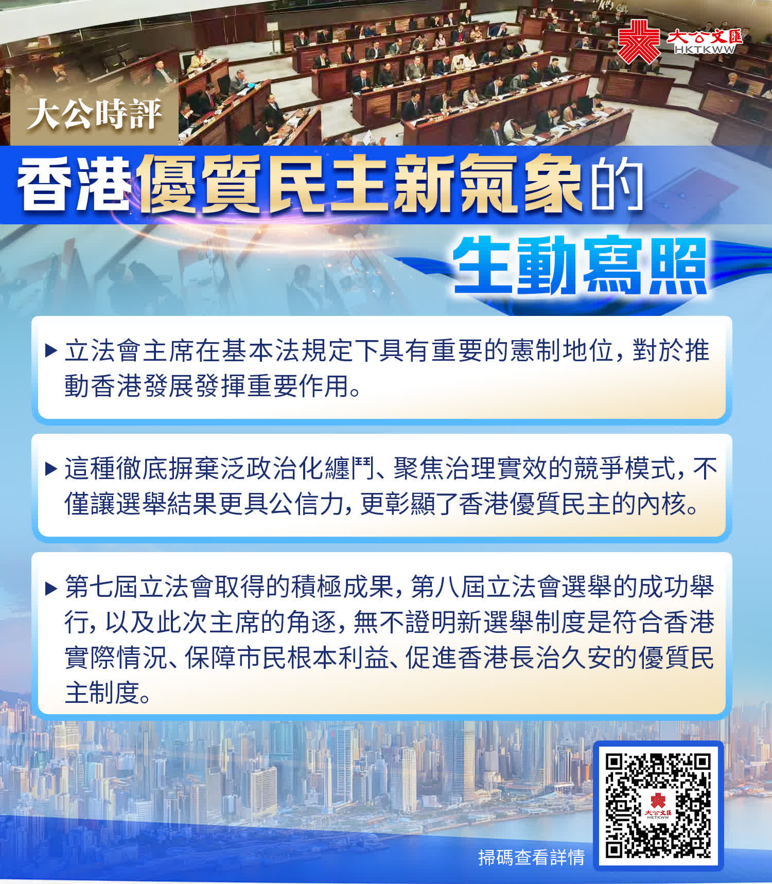 選舉落幕之際,便是履職啟航之時。作為議會的「掌舵人」,立法會主席李慧琼肩負起推動行政立法良性互動、凝聚各方共識、推動香港發展的關鍵職責。當前,香港正處於融入國家發展大局、實現由治及興的關鍵戰略機遇期,立法會作為管治團隊的重要組成部分,肩負着推動對接「十五五」規劃、深化粵港澳大灣區融合發展、破解民生長期痛點的重大使命。各界相信,新一屆立法會必將在立法會主席的帶領下,履行好基本法賦予的使命責任,落實好行政長官李家超提出的三個期盼,不負中央和市民的殷切期許,勇擔當、善作為、重實效,為推動香港加快邁向由治及興,發揮更大的作用、作出更大的貢獻。
