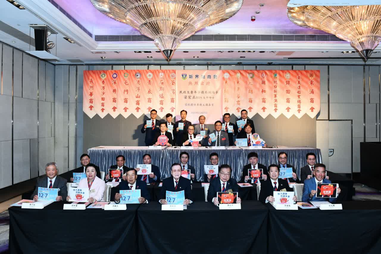 新界總商會日前假美麗華酒店舉行董事例會,邀請民政及青年事務局副局長梁宏正擔任主講嘉賓,分享「地區治理與青年工作」。出席的新界總商會成員約80人,包括會長張德熙,會務委員會主席周駿達,副會長周華焯、何光耀、梁鐵夫、齊光華、李國強、區宇凡、張永德、宋玲鋆、周錦威、黎曉峰,副主席黃志源、朱德榮、梁金塘、莊金寧、陳安立、馬沛強,會務顧問陳子政、何君堯,法律顧問譚健業、黃志剛,屬會青衣商會主席柳振錦等。