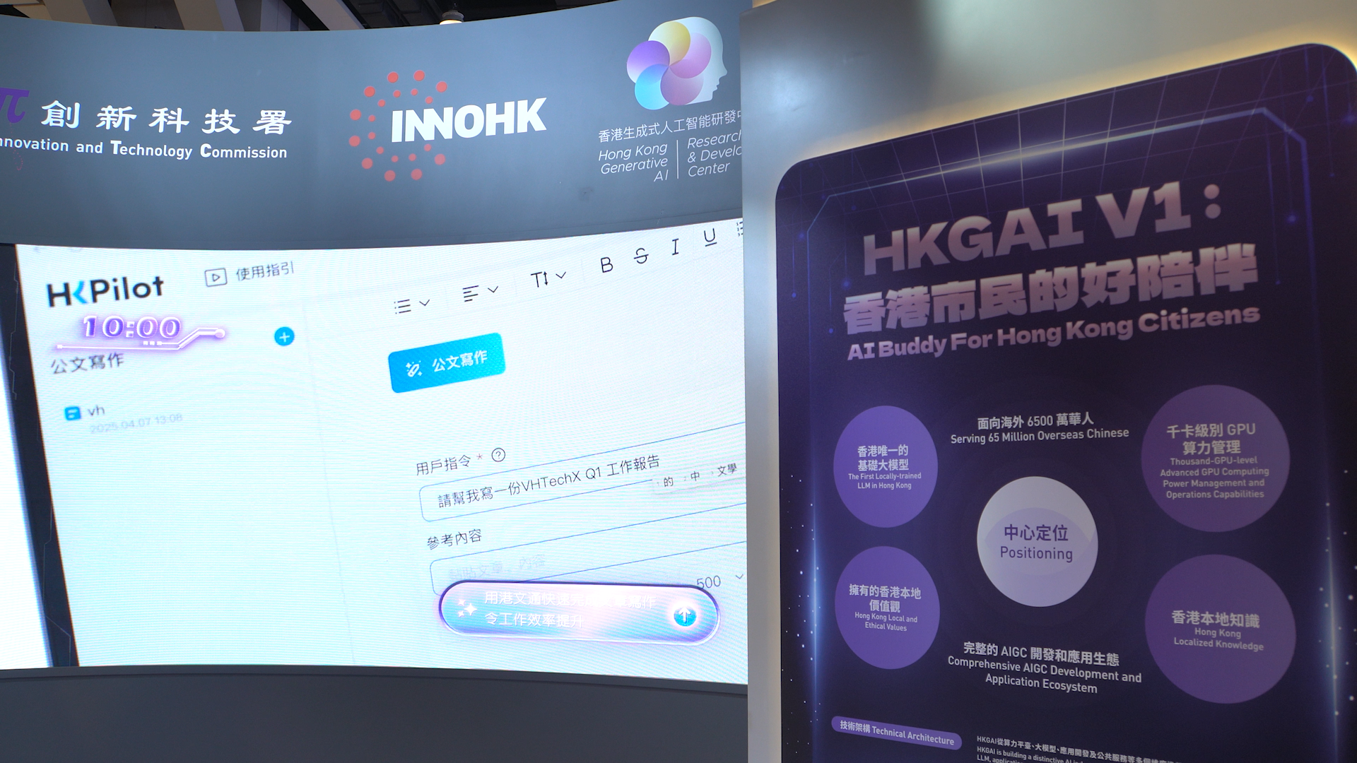 在「InnoHK創新香港研發平台」支持下,2023年10月,香港生成式人工智能研究中心(中心)因應而生,中心在短短的一年時間內成功研發了香港首個大語言基礎模型,並於2025年初迅速將DeepSeek的底座模型架構與HKGAI模型的數據處理功能有機結合,推出HKGAI V1大語言基礎模型版本。這個懂香港話的地道大語言模型,正是以「香港市民的好陪伴」為願景而研發誕生。