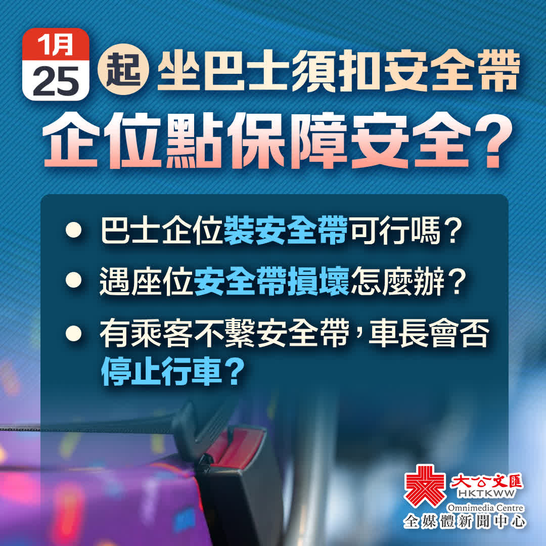 (大公文匯全媒體 記者 盧葦)1月25日起,現行強制安裝及配用安全帶的法定要求將延伸至巴士、校巴等。所有公共交通工具和商用車的座位,如已安裝安全帶,乘客均須佩戴安全帶,違例者最高可處罰款5000元及監禁3個月。乘客若不繫安全帶,司機毋須負上法律責任,所有乘客須為自身行為負責。大公文匯全媒體早點在街頭隨機訪問市民對新條例的看法,有市民提出疑慮:「巴士座位有安全帶,企位乘客卻沒有任何保護,最多只能抓住扶手,他們的安全如何保障?」