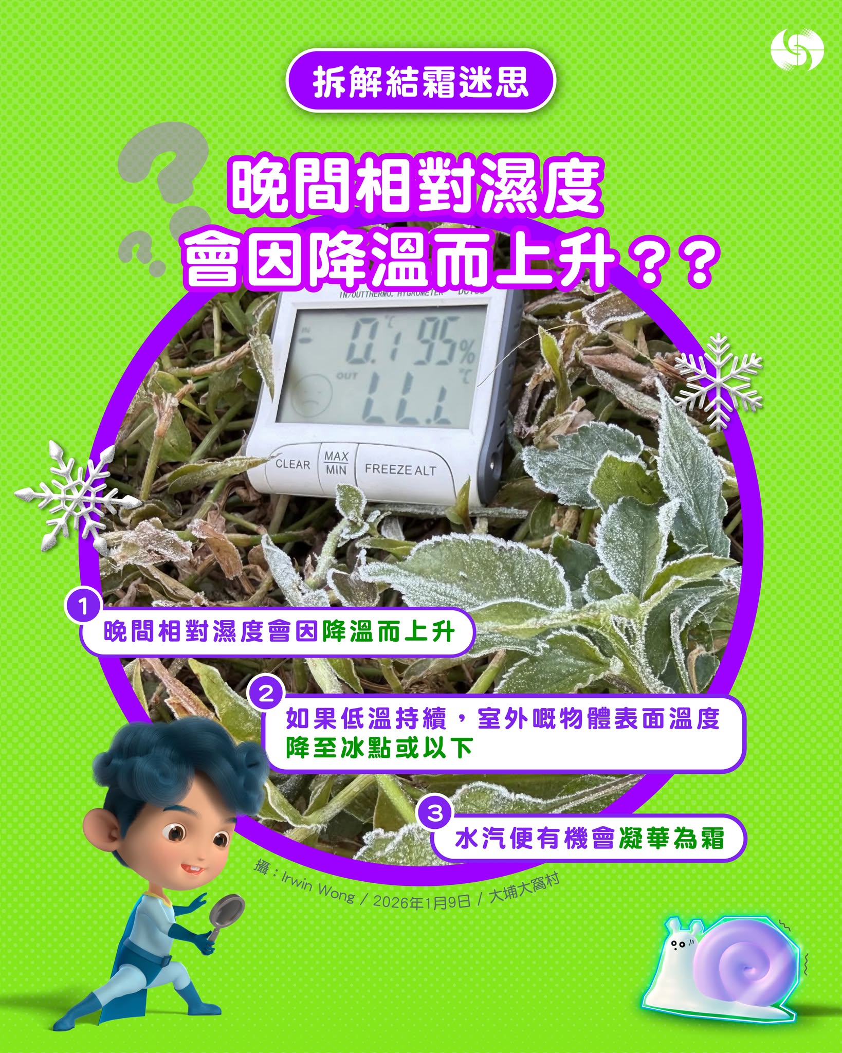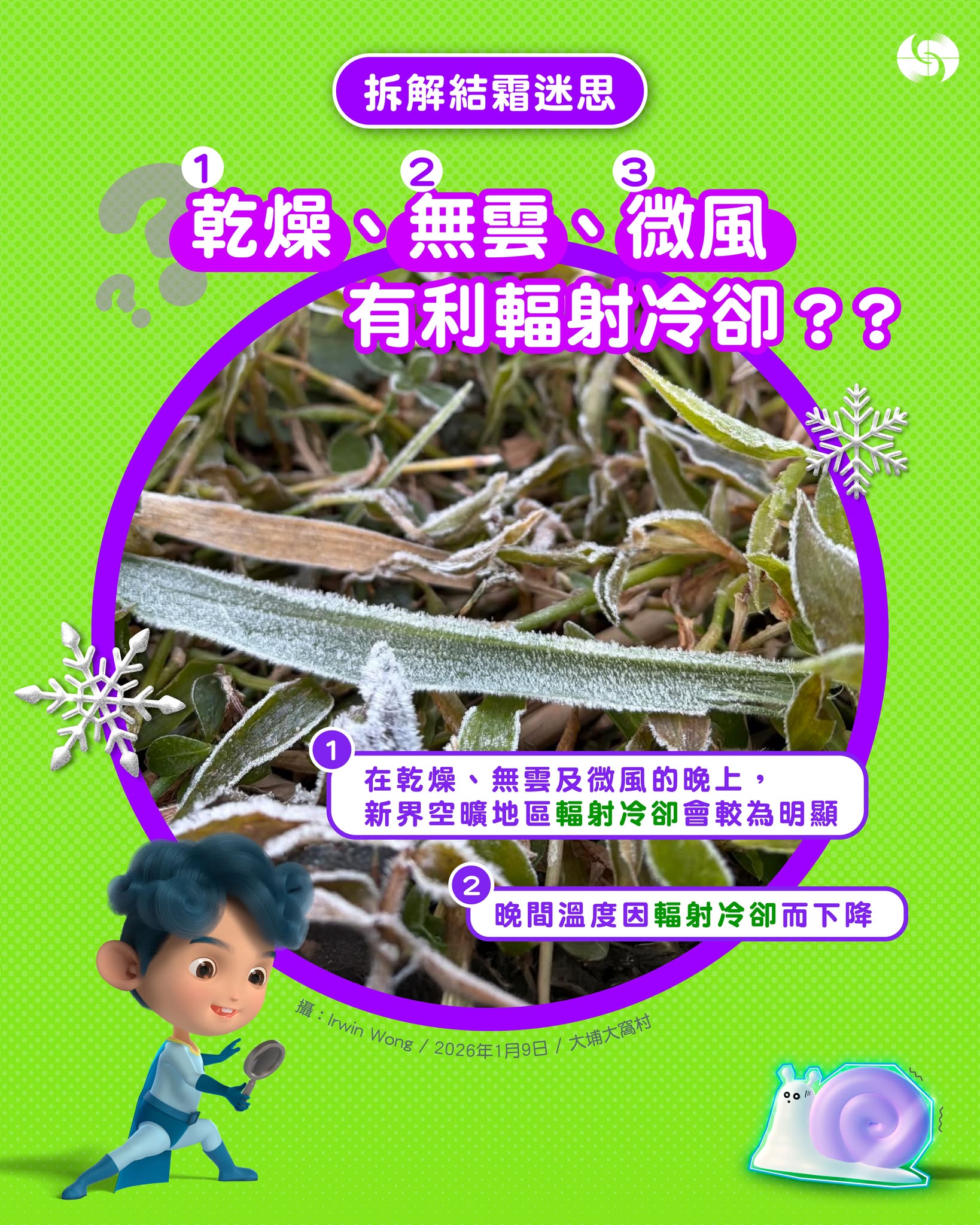 天文台表示,好多人以為天氣乾燥就無咁易結霜,其實就算日間非常乾燥,但是在無雲及微風的晚上,新界空曠地區輻射冷卻會較為明顯,當晚間溫度下降,夜晚相對濕度就會上升,如果低溫持續,室外地面及無遮蔽物體表面的溫度降至冰點或以下,水汽便有機會凝華為霜。
