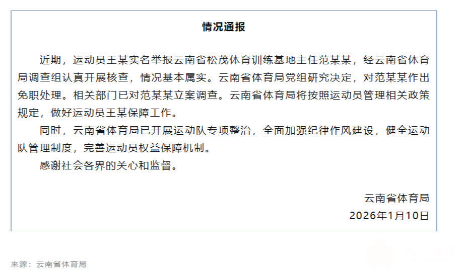 據新華社報道,雲南省體育局1月10日晚間發布情況通報。通報稱,近期,運動員王某實名舉報雲南省松茂體育訓練基地主任范某某,經雲南省體育局調查組認真開展核查,情況基本屬實。雲南省體育局黨組研究決定,對范某某作出免職處理。相關部門已對范某某立案調查。雲南省體育局將按照運動員管理相關政策規定,做好運動員王某保障工作。同時,雲南省體育局已開展運動隊專項整治,全面加強紀律作風建設,健全運動隊管理制度,完善運動員權益保障機制。