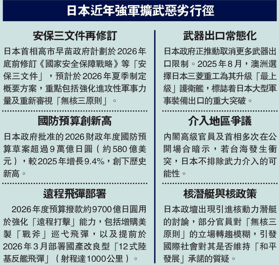日本一系列強軍擴武的動作,引發各方高度關注,多國輿論亦不斷敲響警鐘。韓國《亞洲時報》評論稱高市政府激進舉動正加速地區危機動態,可能使日本自我孤立。馬來西亞政界人士撰文痛批日本殖民侵略曾給亞洲帶來空前浩劫,指出高市否認侵略歷史、干涉中國內政暴露出「軍國主義幽靈未散」,這是對歷史正義的踐踏。