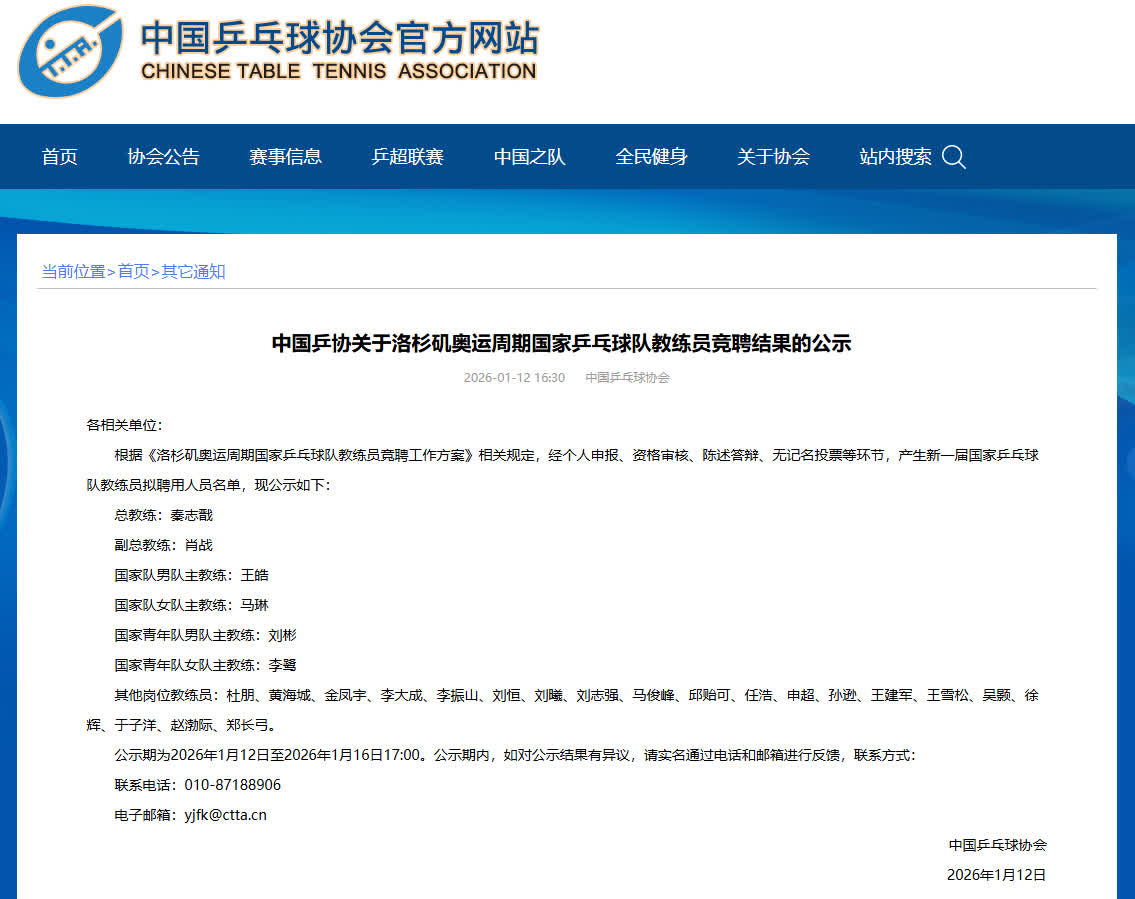據新華社報道,中國乒協官網12日公示洛杉磯奧運周期國家乒乓球隊教練員競聘結果,擬聘秦志戩為總教練、肖戰為副總教練、王皓為男隊主教練、馬琳為女隊主教練。