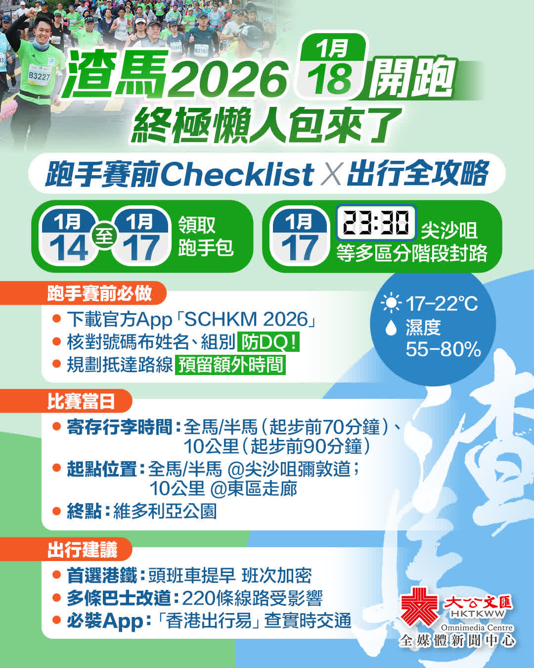 參賽者可於明日(14日)至本周六(17日),按預約時段前往啟德體育園體藝館領取跑手包,領取前必須下載大會官方應用程式「SCHKM2026 Official App」(點擊下載)進行預約。同場將舉辦馬拉松博覽會,提供活動及商品售賣。大會提醒,需寄存行李的全馬及半馬跑手,須於比賽開始前70分鐘到達行李檢查站;十公里跑手則需提前90分鐘。