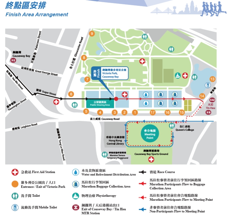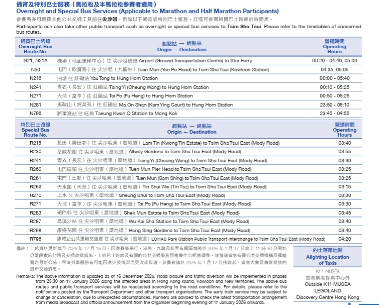 封路期間,共有220條日間巴士線、34條日間專線小巴、49條通宵巴士及6條通宵小巴路線需分階段暫停、縮短或改道,天后、中環、尖沙咀等多個巴士總站將暫停使用。為疏導人潮,港鐵8條鐵路綫的頭班車將於本周日提早開出,最早於凌晨3時25分行駛。此外,大會將設立28條特別巴士路線服務參賽者及市民。