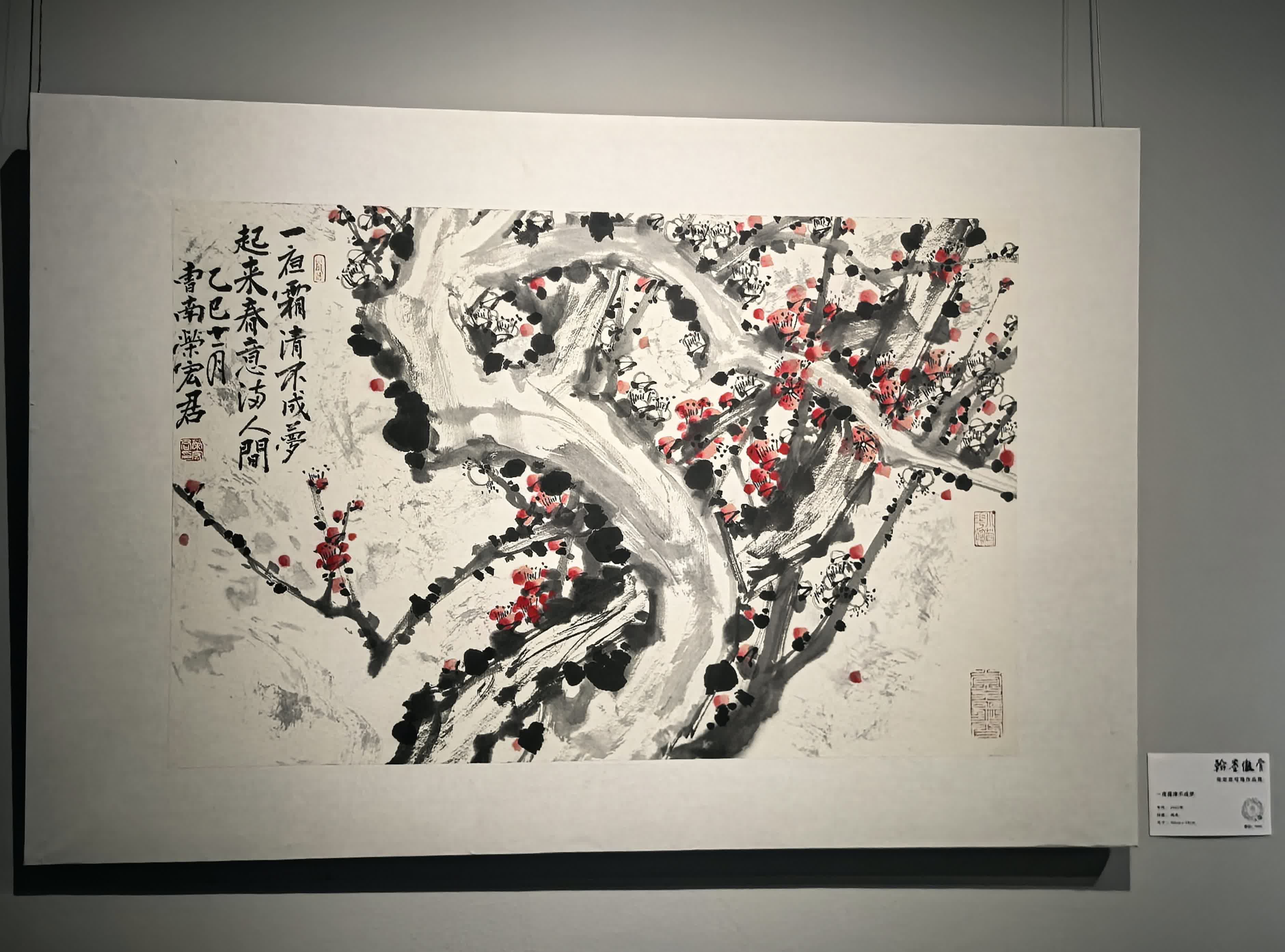 記者走進展廳,六十餘幅梅花作品映入眼帘,或濃墨重彩、硃砂點艷,或淡墨留白、清勁孤高,每一筆都呈現着榮宏君對「梅之傲骨」的體悟。其筆下的梅花深得宋元風骨,還兼融了近代諸家之長。著名學者、文物鑒定家史樹青曾盛讚他的作品「枝條峭拔,蕊朵昂然,鬥豔爭奇,堪可稱道」。據了解,榮宏君作品之《白梅》曾被人民大會堂收藏,多幅作品也亦頻頻作為國禮贈予外國政要。