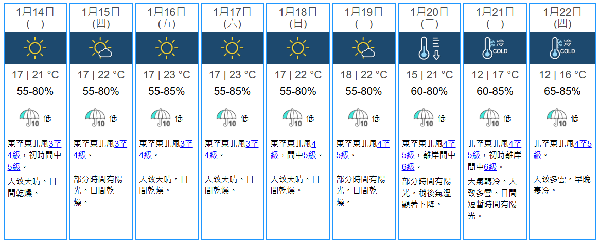 大公文匯全媒體報道,天文台表示,周三(14日)大致天晴,早上市區最低氣溫約17度,新界再低幾度,日間乾燥,最高氣溫約21度。吹輕微至和緩東至東北風,明日初時風勢間中清勁。本周餘下時間至下周初持續大致天晴,早上清涼,日間和暖,下周中後期氣溫顯著下降。
