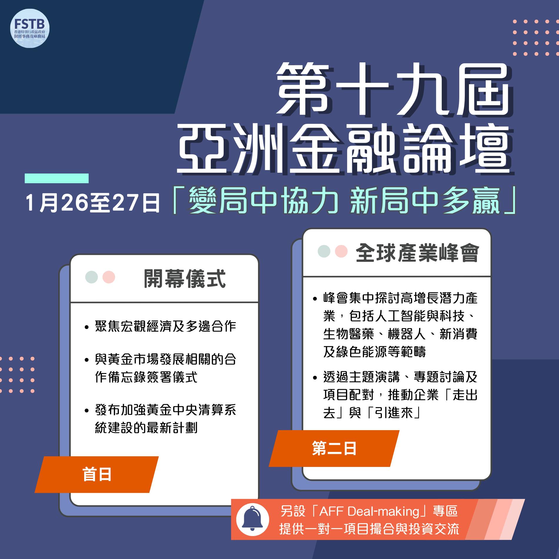 許正宇表示,為推動金融與實體經濟深度融合,政府將於1月26至27日舉辦第十九屆亞洲金融論壇(AFF),以「變局中協力 新局中多贏」為主題,匯聚全球金融與產業領袖,探討在複雜多變的國際環境中實現共贏,並首次新增「全球產業峰會」(Global Business Summit)環節。
