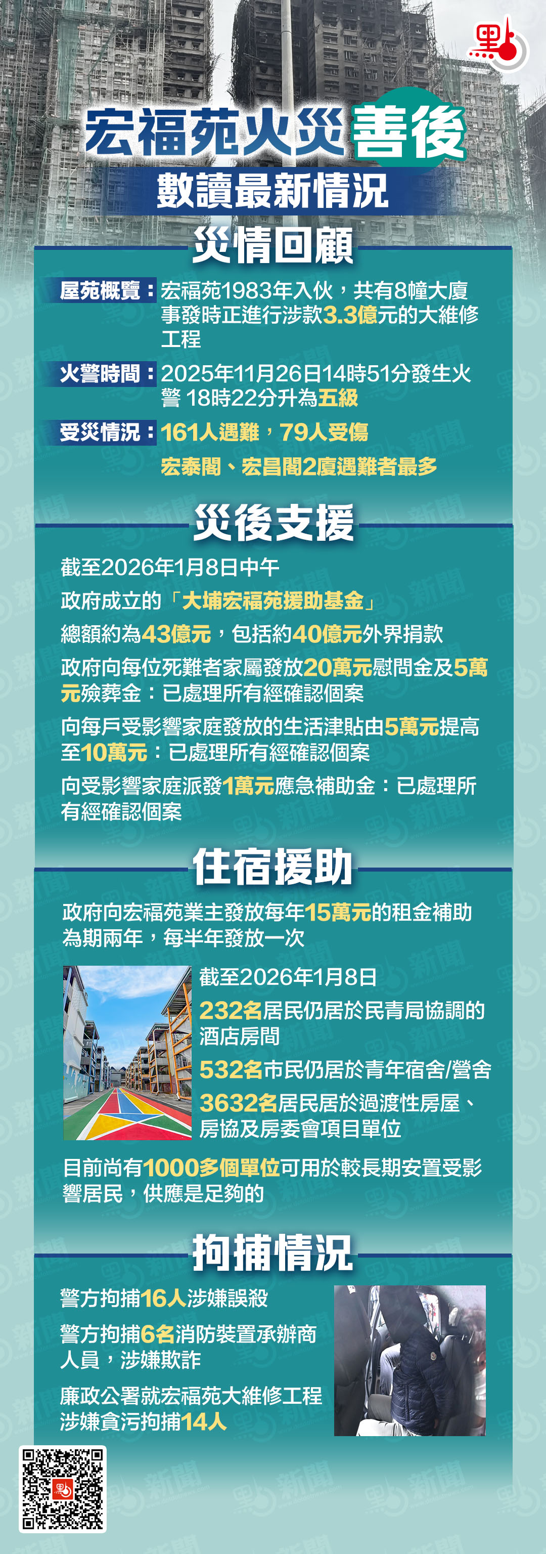 在住宿援助方面,政府上月宣布兩項支援受影響居民的新措施,包括向宏福苑業主發放為期兩年、每年15萬元的租金補助,每半年發放一次;以及向業主及租戶分別提供一次性5萬元搬遷補助,相關資助以每個單位為基礎,將透過「一戶一社工」發放。