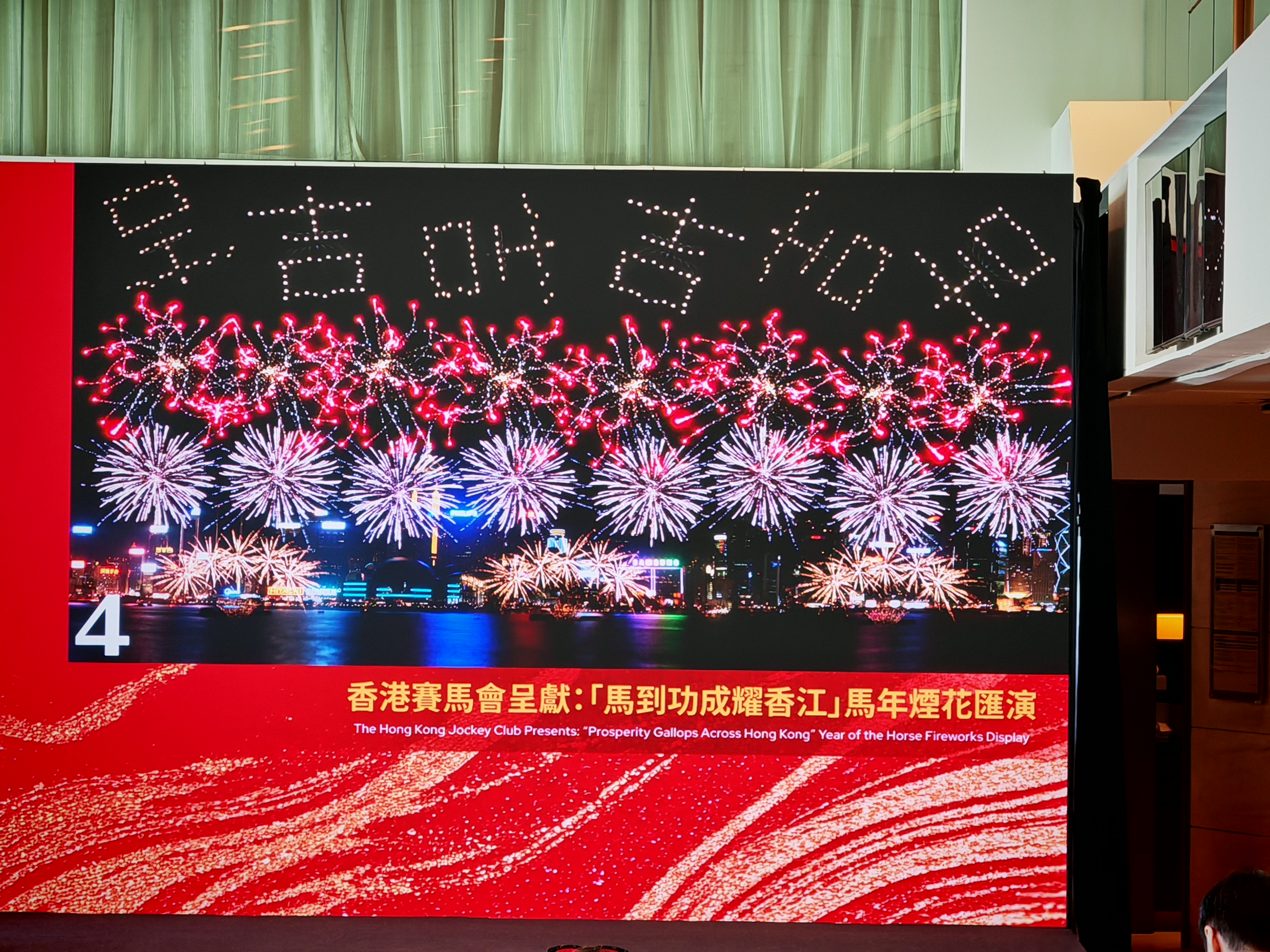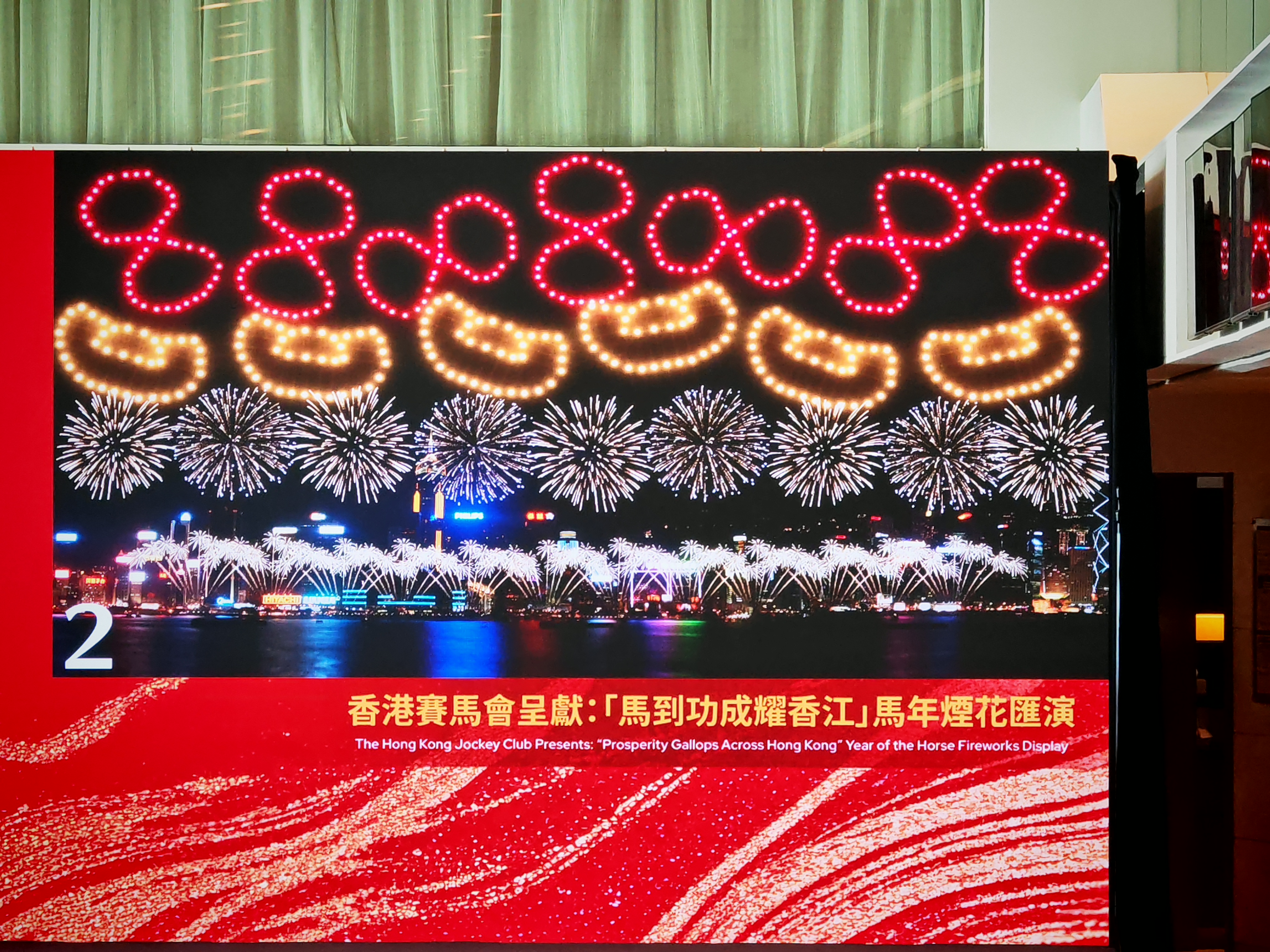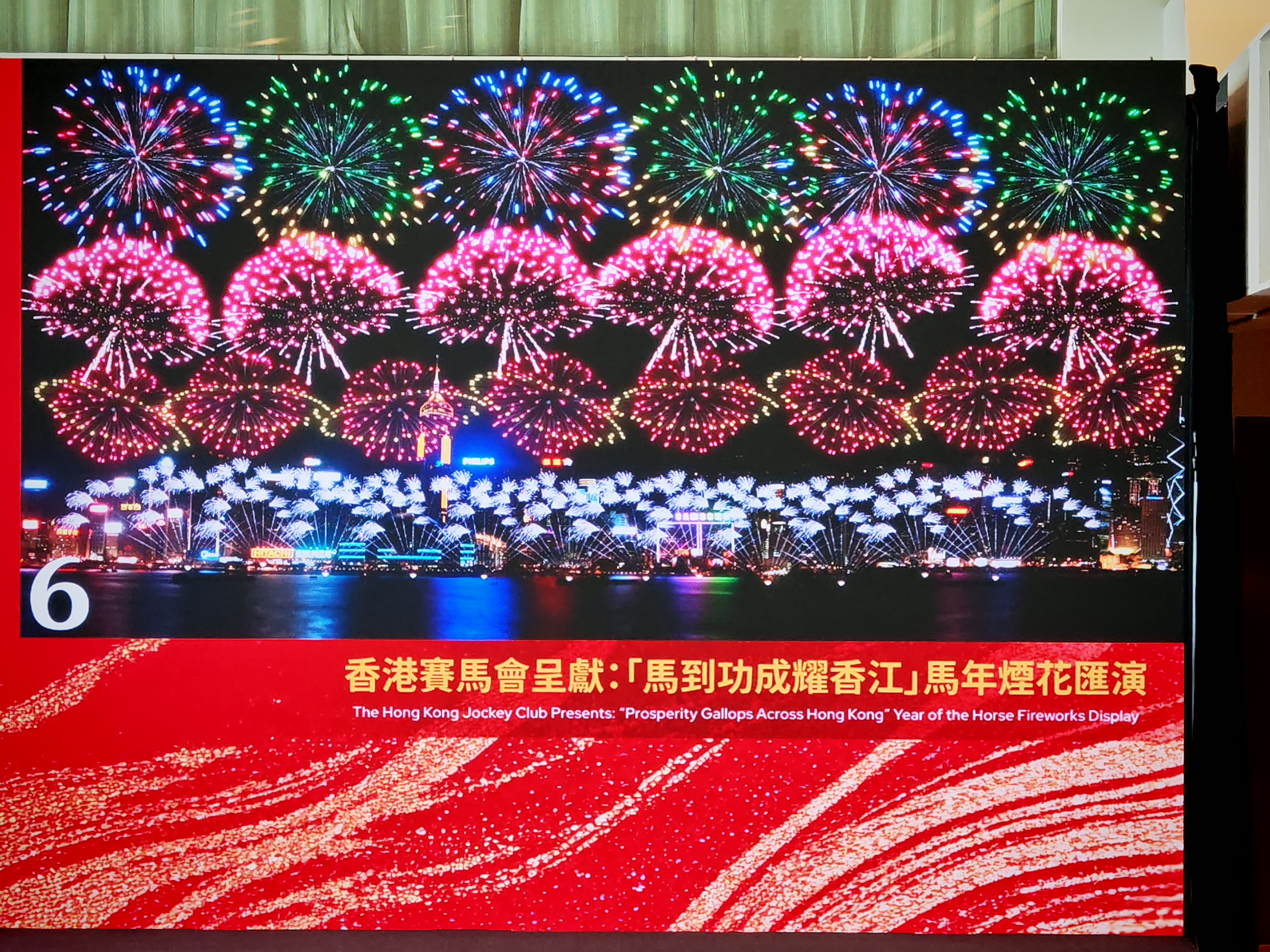「躍馬騰飛」一幕把香港人熟悉的賽馬場景搬上夜空,以「馬蹄鐵」造型禮花彈作高空追逐效果,營造萬馬奔騰、馬蹄疾響的視覺節奏。低空追逐煙花與「WIN」字樣遙相呼應,象徵馬年旗開得勝,祝願大家在事業、學業與人生賽道上全線報捷。