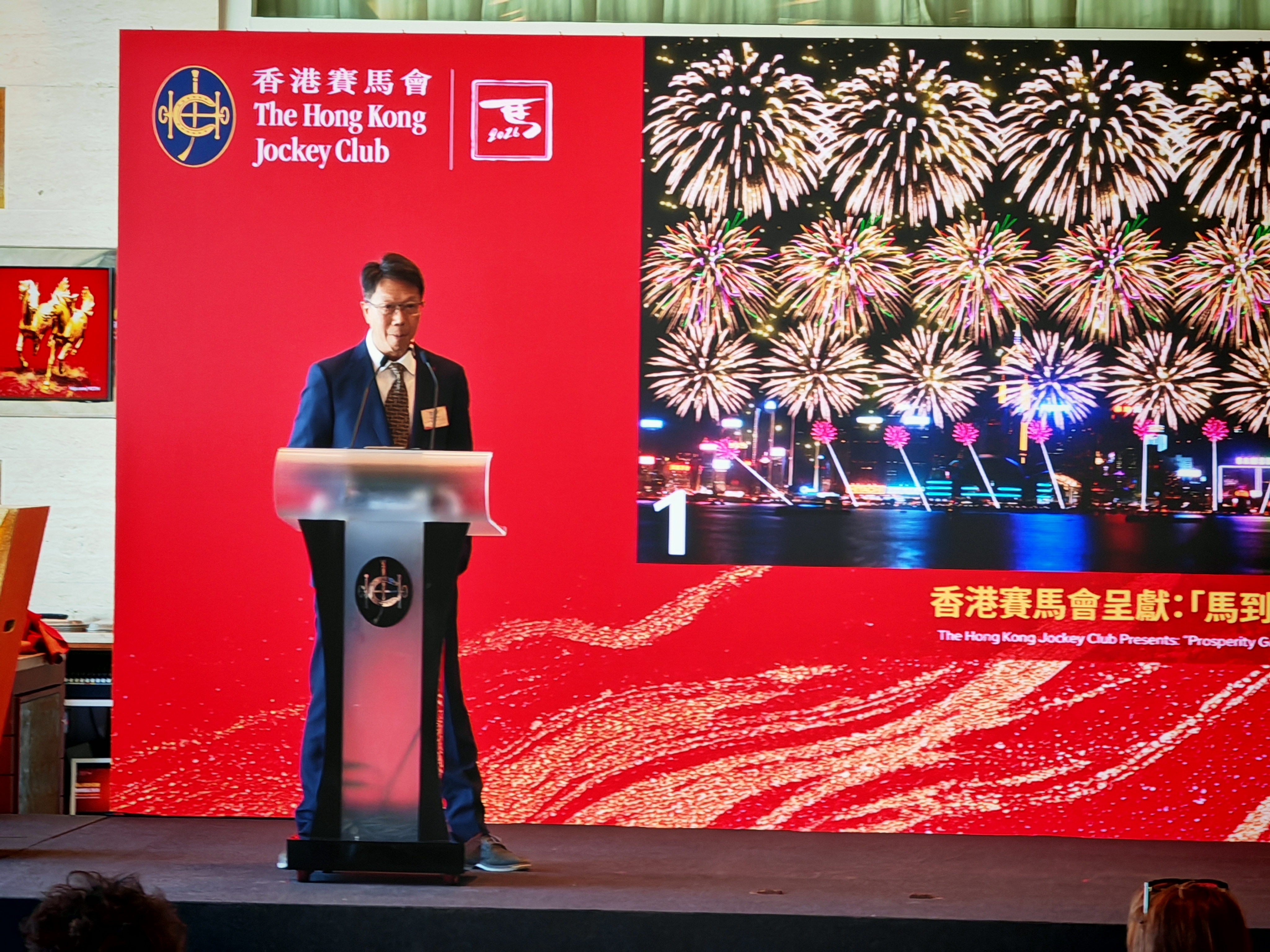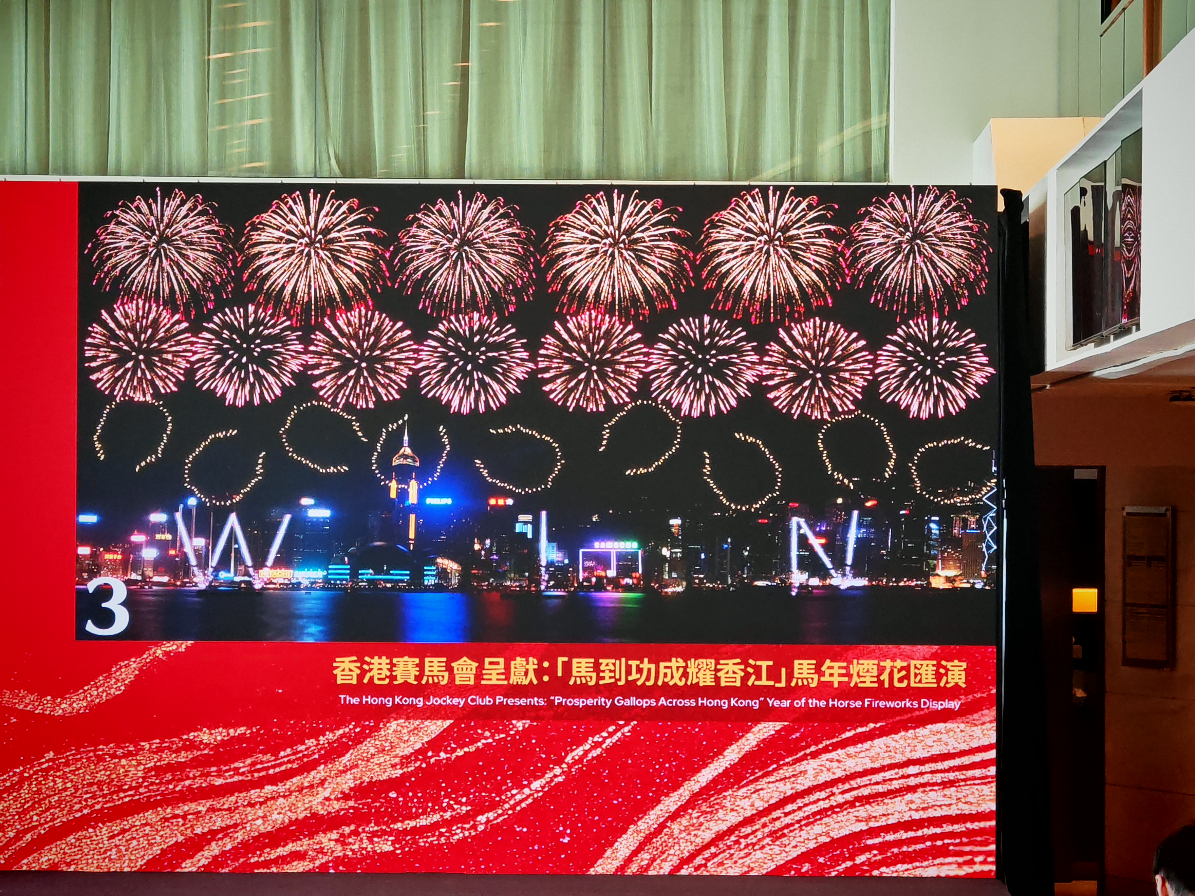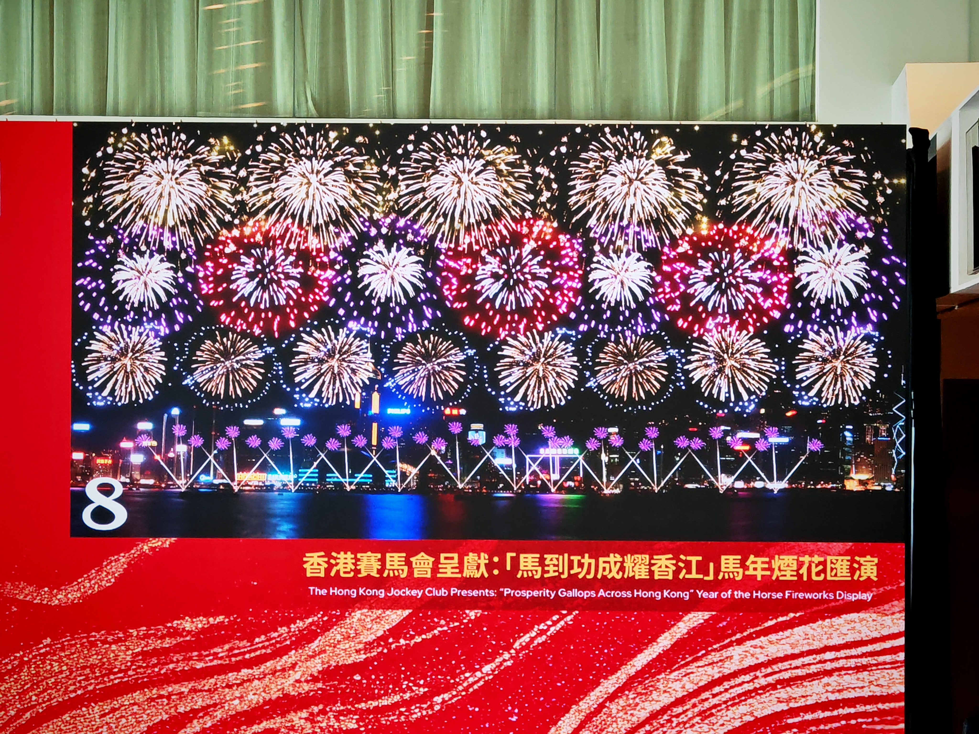 「躍馬騰飛」一幕把香港人熟悉的賽馬場景搬上夜空,以「馬蹄鐵」造型禮花彈作高空追逐效果,營造萬馬奔騰、馬蹄疾響的視覺節奏。低空追逐煙花與「WIN」字樣遙相呼應,象徵馬年旗開得勝,祝願大家在事業、學業與人生賽道上全線報捷。