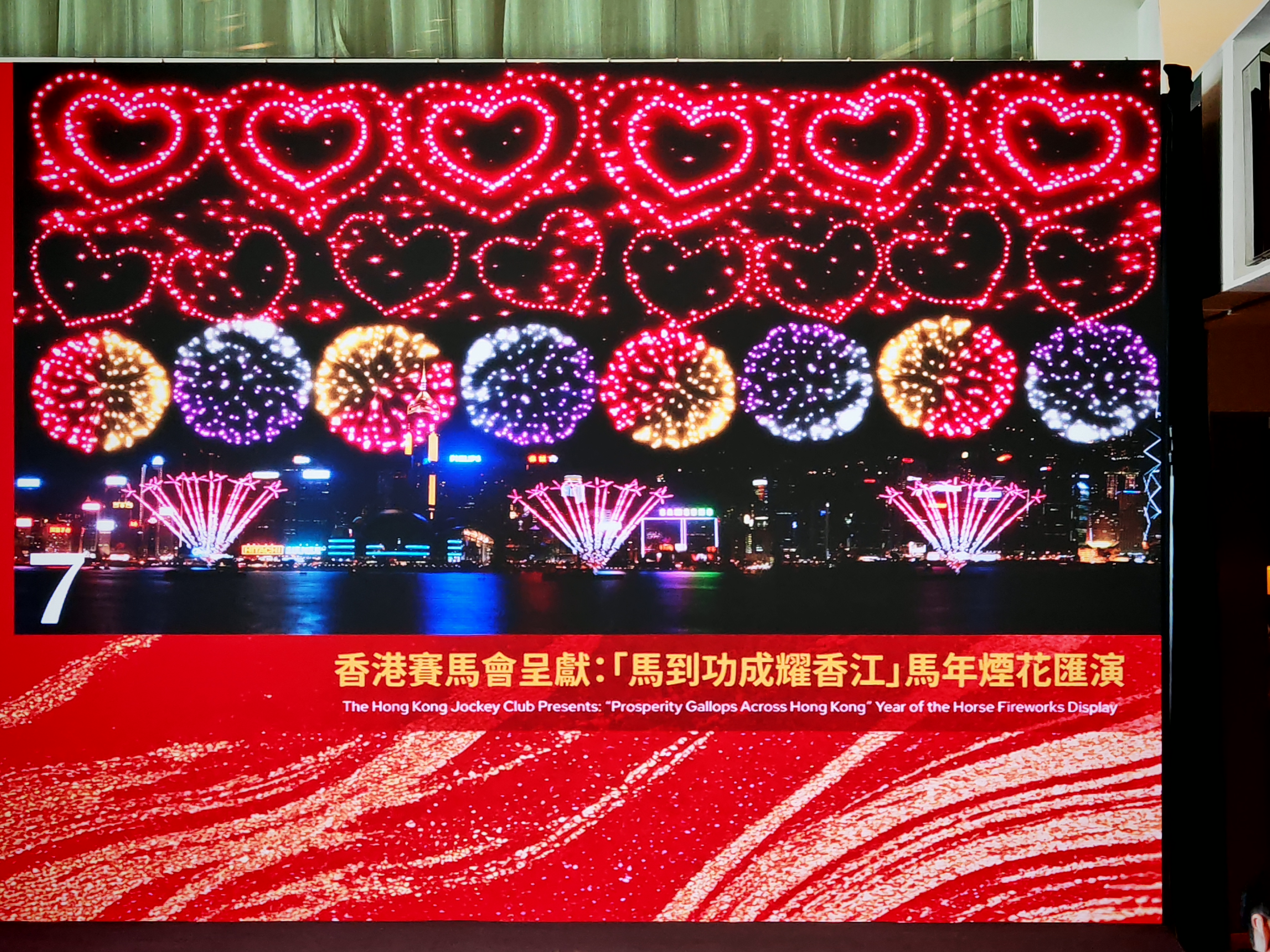 以滿天心形禮花彈展現市民對香港的深情,象徵大家同心同德,在馬年攜手奔向更美好的明天。交錯綻放的煙花寓意你我共同參與,各界攜手合作共贏,一同為城市開拓新機遇、打造多姿多彩的未來。