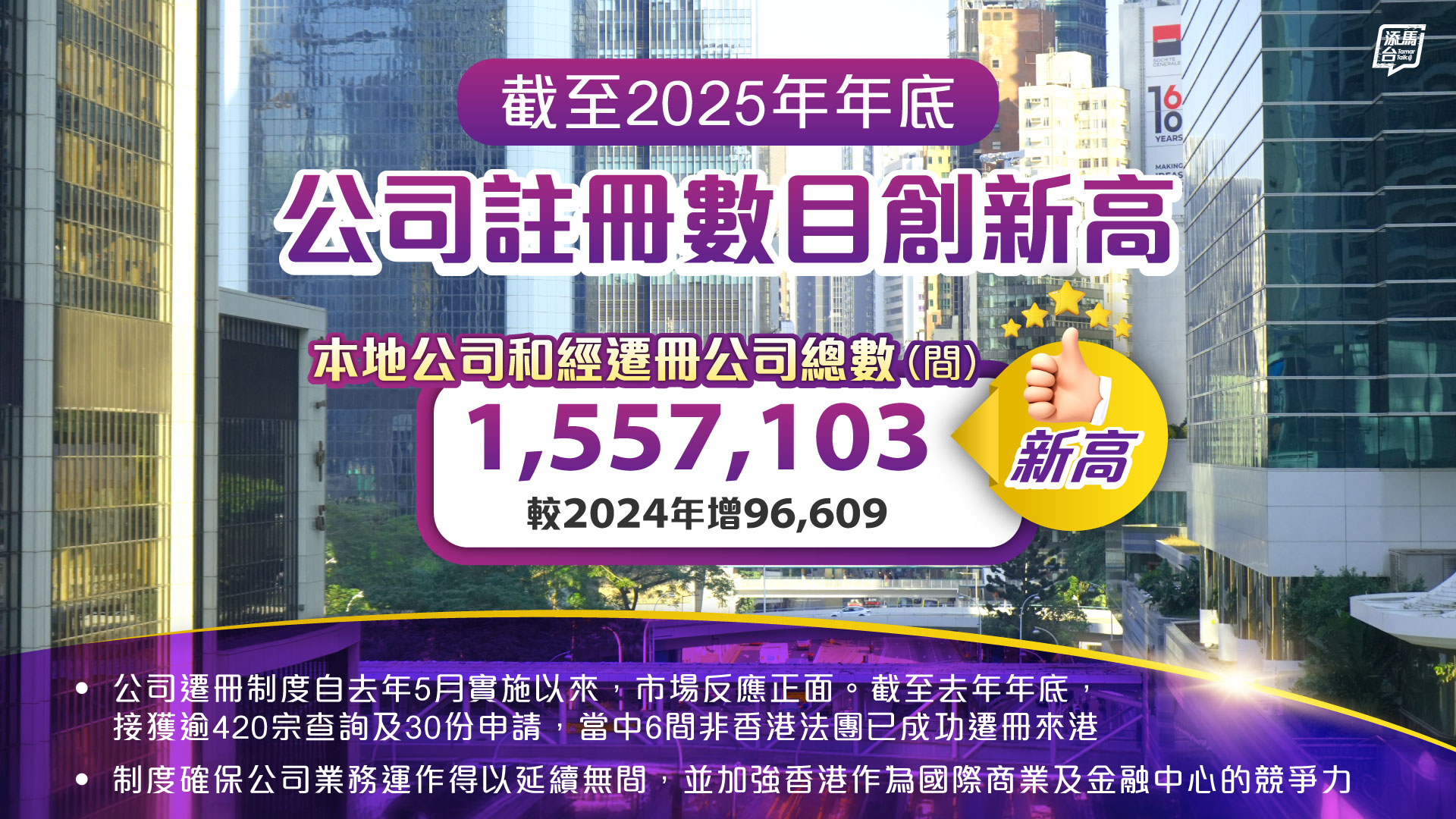 根據公司註冊處今日(1月16日)發表的統計數字顯示,2025年新成立的本地公司和經遷冊公司總數為195,343間。截至2025年年底,根據《公司條例》註冊的本地公司和經遷冊公司總數創歷史新高。看圖了解更多。