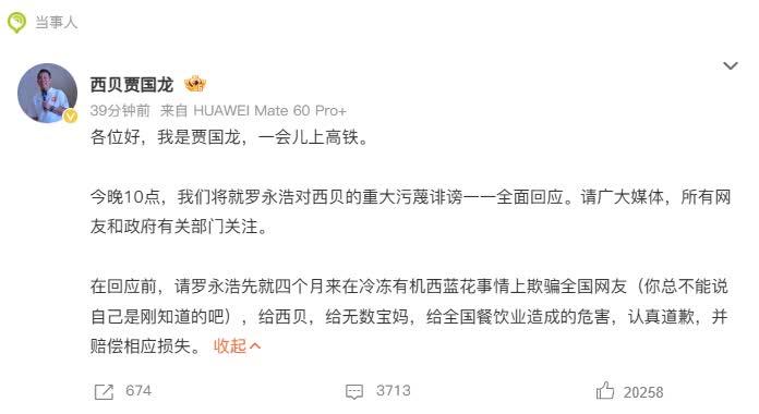 大公文匯網報道,1月16日,西貝餐飲創始人賈國龍發文稱,今晚10點,將就羅永浩對西貝的重大污衊誹謗一一全面回應。將賈、羅兩人持續四個月的預製菜輿論戰推向新高潮。