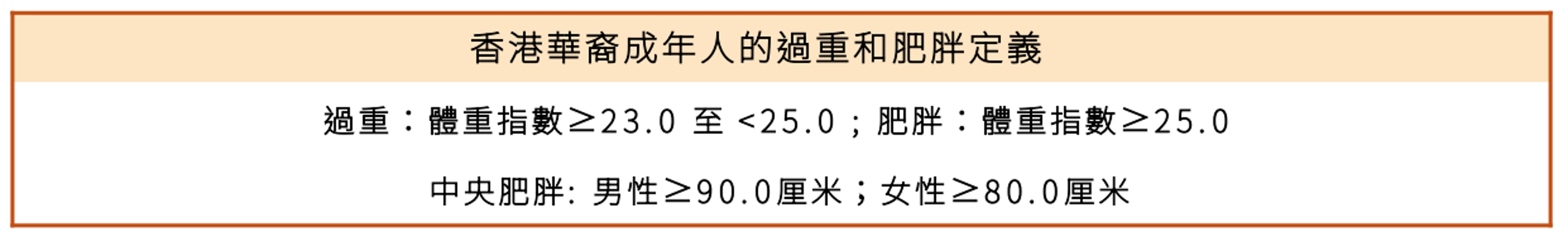過高的體脂及腹腔內脂肪過度積存與癌症風險增加息息相關。對於亞洲成年人而言,體重指數(body mass index, BMI)≥23.0 被視為過重,而 ≥25.0 則界定為肥胖。亞洲人的 BMI 臨界值與西方人的不同,原因在 於相比西方人,亞洲人在相同體重指數水平下的體脂率和心血管代謝風險較高。