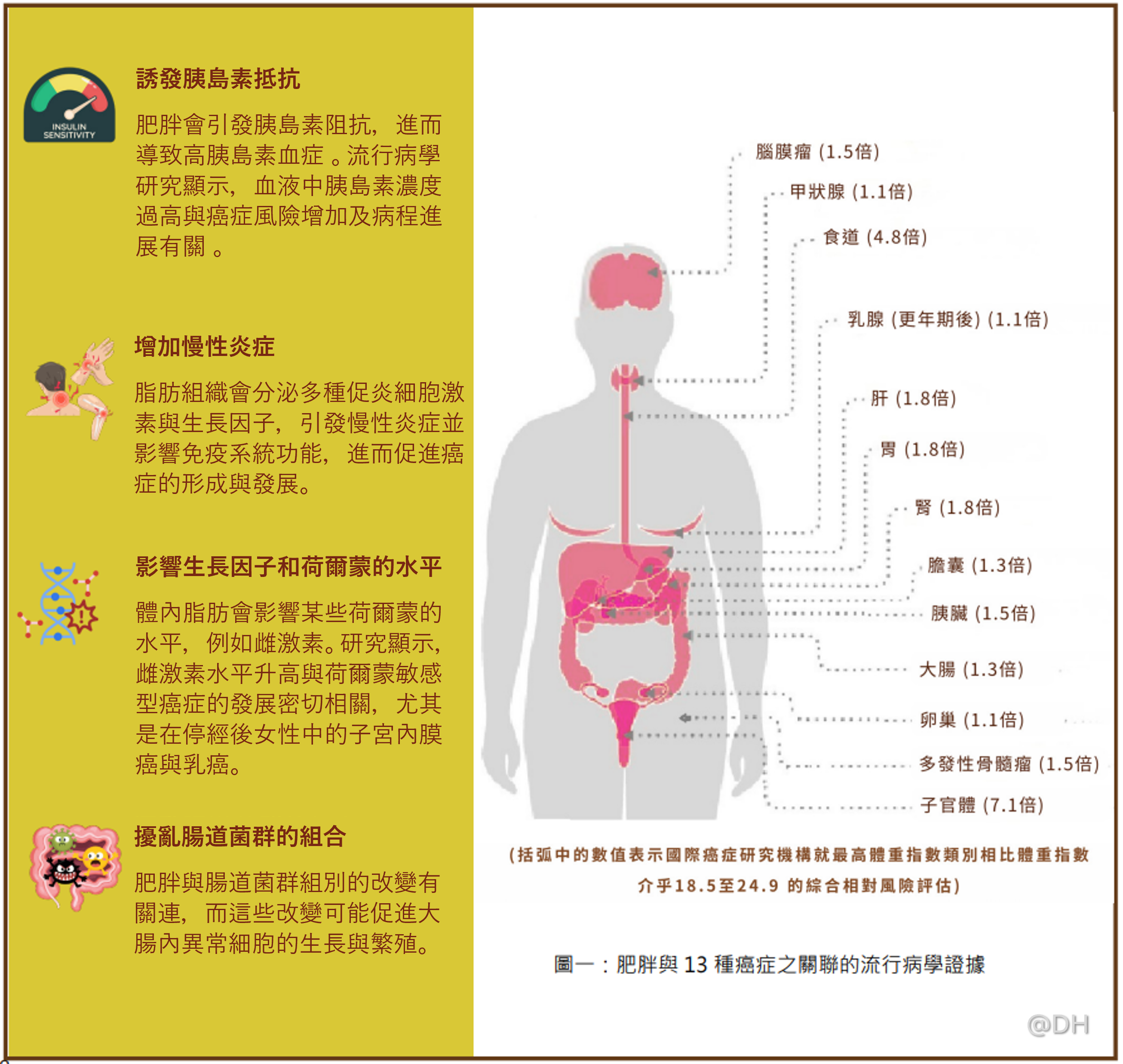 有充分流行病學證據顯示,肥胖會透過多種機制增加罹患至少 13 種癌症的風險,相對風險為正常體重的 1.1 倍至 7.1 倍不等(圖一)。腹部脂肪過多也已證實會增加罹患子宮內膜癌以及包括肝癌和食道癌等消化系 統癌症的風險。