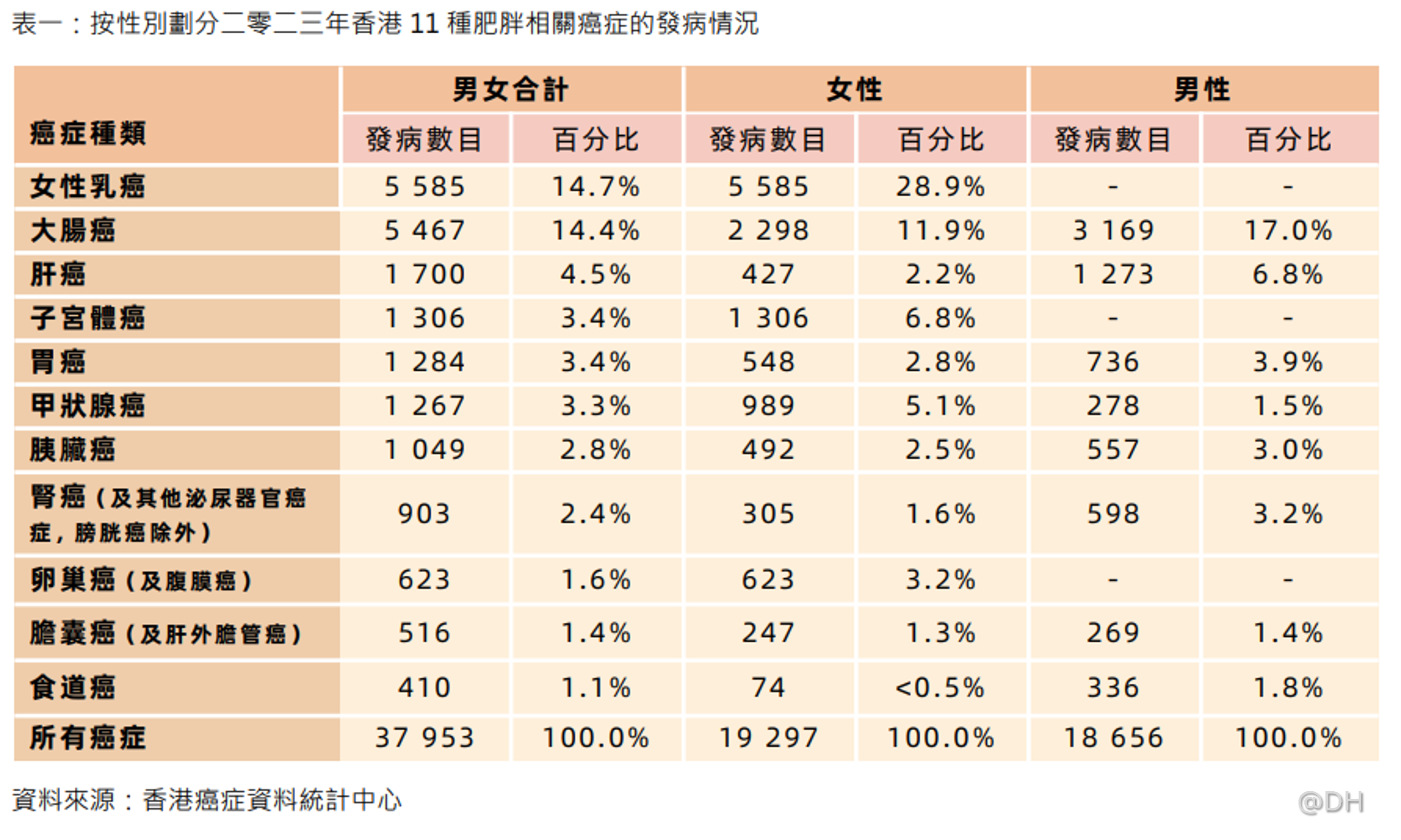 在二零二三年所錄得的 37 953 宗新增癌症個案中,11 種與肥胖相關的癌症佔逾半(53.0%), 且在發病情況與癌症種類呈現明顯的性別差異。 整體而言,最常見的 5 種肥胖相關癌症為女性乳癌 (14.7%)、大腸癌(14.4%)、肝癌(4.5%)、子宮體癌(3.4%)和胃癌(3.4%)。如表一所示,女 性最常見的肥胖相關癌症是乳癌(28.9%)、大腸癌(11.9%)和子宮體癌(6.8%)。至於男性,最常見的肥胖相關癌症為大腸癌(17.0%)、肝癌(6.8%)和胃癌(3.9%)。