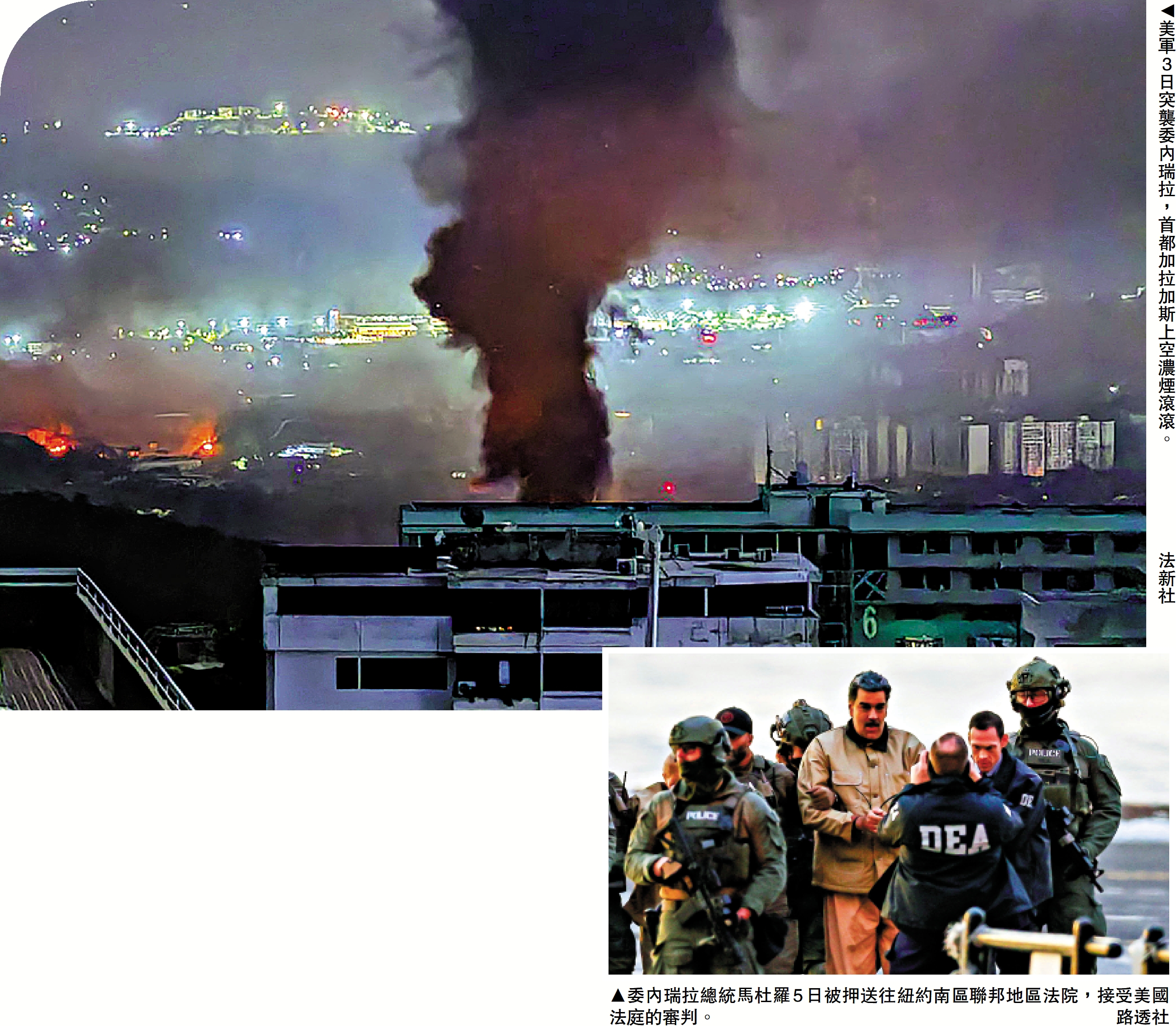 2026年的新年鐘聲剛剛敲響,加勒比海的夜空就被戰機轟鳴撕裂。特朗普3日在社交媒體上發布一張馬杜羅在美國軍艦上戴手銬、雙眼被蒙住的照片。英國《星期日郵報》在頭版刊登了這張照片,並配以醒目標題─「美國走上戰爭之路」。