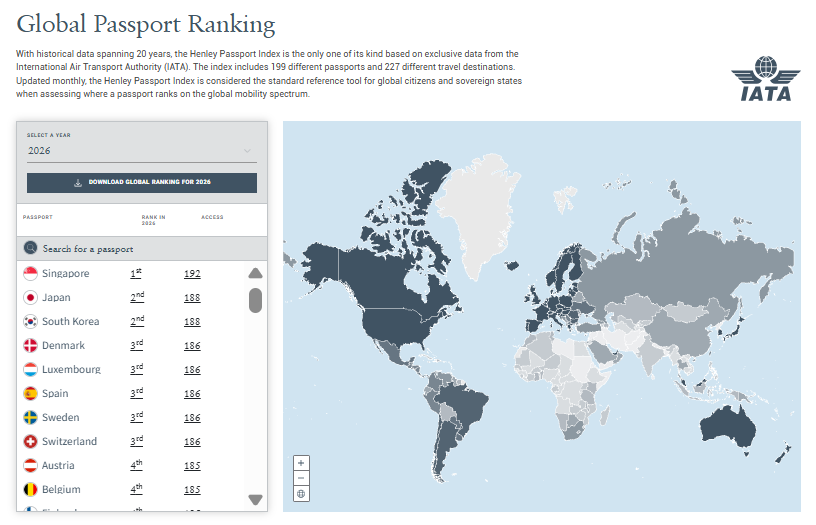 大公文匯全媒體報道,英國諮詢公司Henley&Partners近日公布2026亨利護照指數(Henley Passport Index),排名覆蓋199個國家及地區、227個旅行目的。結果顯示,新加坡蟬聯榜首、日本和韓國並列第二,丹麥、盧森堡、西班牙、瑞典和瑞士以186個免簽地並列第三。