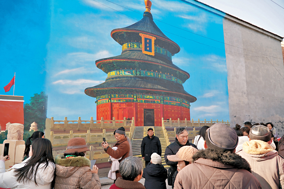 (香港文匯報 記者劉蕊、實習記者張媛媛 河南商丘報道)豫東商丘市晨陽和煦,不到九點的吳營村,煙火氣已漫過街巷。攤販陸續支攤就緒,「天安門」牆繪前,遊客舉着相機打卡、鄉親圍立閒談。「吳老師來了!」穿軍大衣、面色黝黑的吳承言一露面,便被人群圍住。他合照時必用大拇指比「讚」,咧嘴笑時,眼角紋路盛滿暖意。「眼前的熱鬧場景比我畫的任何畫都動人。」鄉村畫師吳承言對香港文匯報記者坦言,「我不是神筆馬良,也不是畫夢師,就是鄉村老人的孩子。老人們去不了的遠方,我用畫筆搬來;他們圓夢了開心了,村子又生機勃勃了,生活更有盼頭了。」