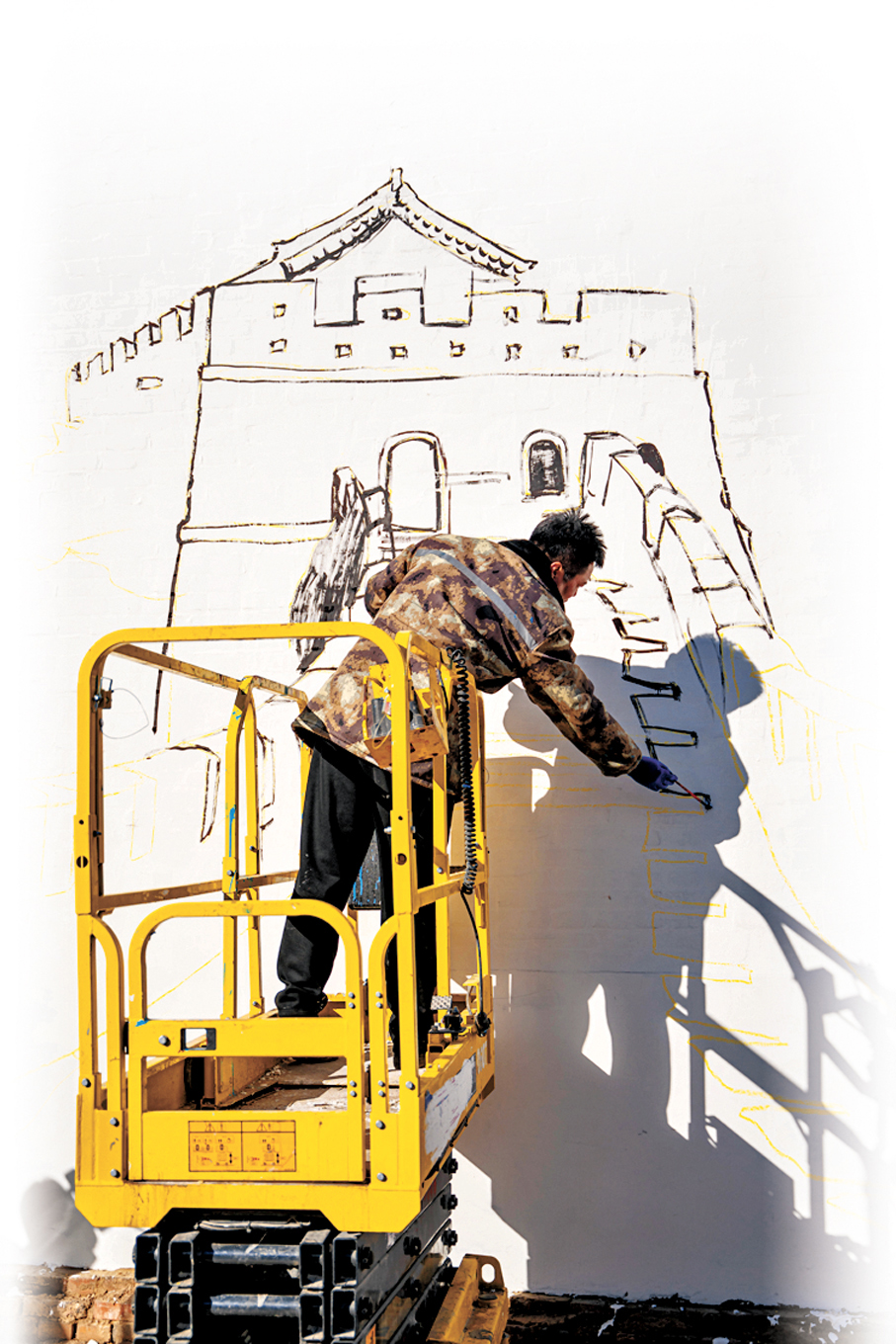 真正讓吳營村「出圈」的,是那幅「天安門」牆繪。打形第一天,村口曬太陽的大爺就喊出:「喲,這是天安門吧?我在電視上見過!」一句話,讓吳承言更添鄭重。五晝夜的堅守裏,他翻遍三百張影像素材,還特意託北京的朋友實拍城樓石柱細節,一筆一畫都透着較真。「我不用速成的噴漆,就用油畫的方式畫,要的就是立體效果和扎實質感。」他要的從不是轉瞬即逝的打卡點,而是能刻進老人記憶裏的風景。