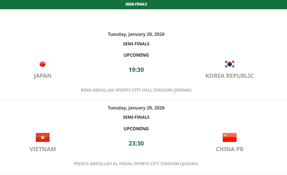 1月20日晚上11時30分,中國隊將與越南隊展開半決賽對決;當晚7時30分,日本隊將迎戰韓國隊。