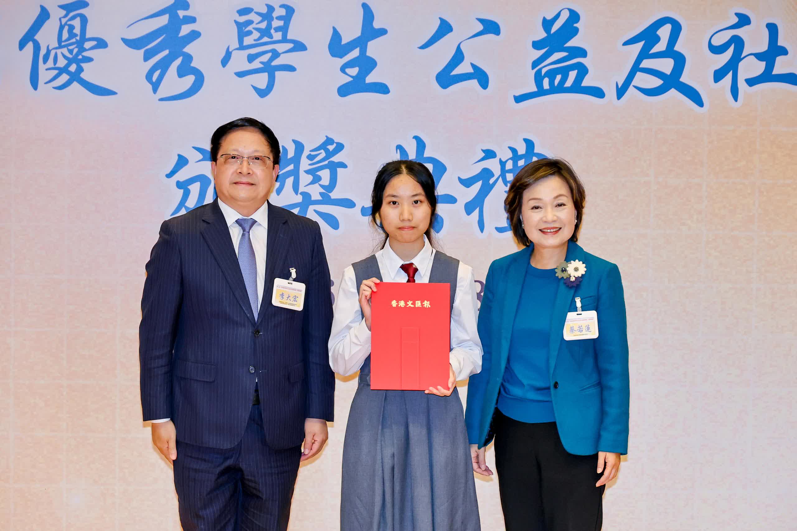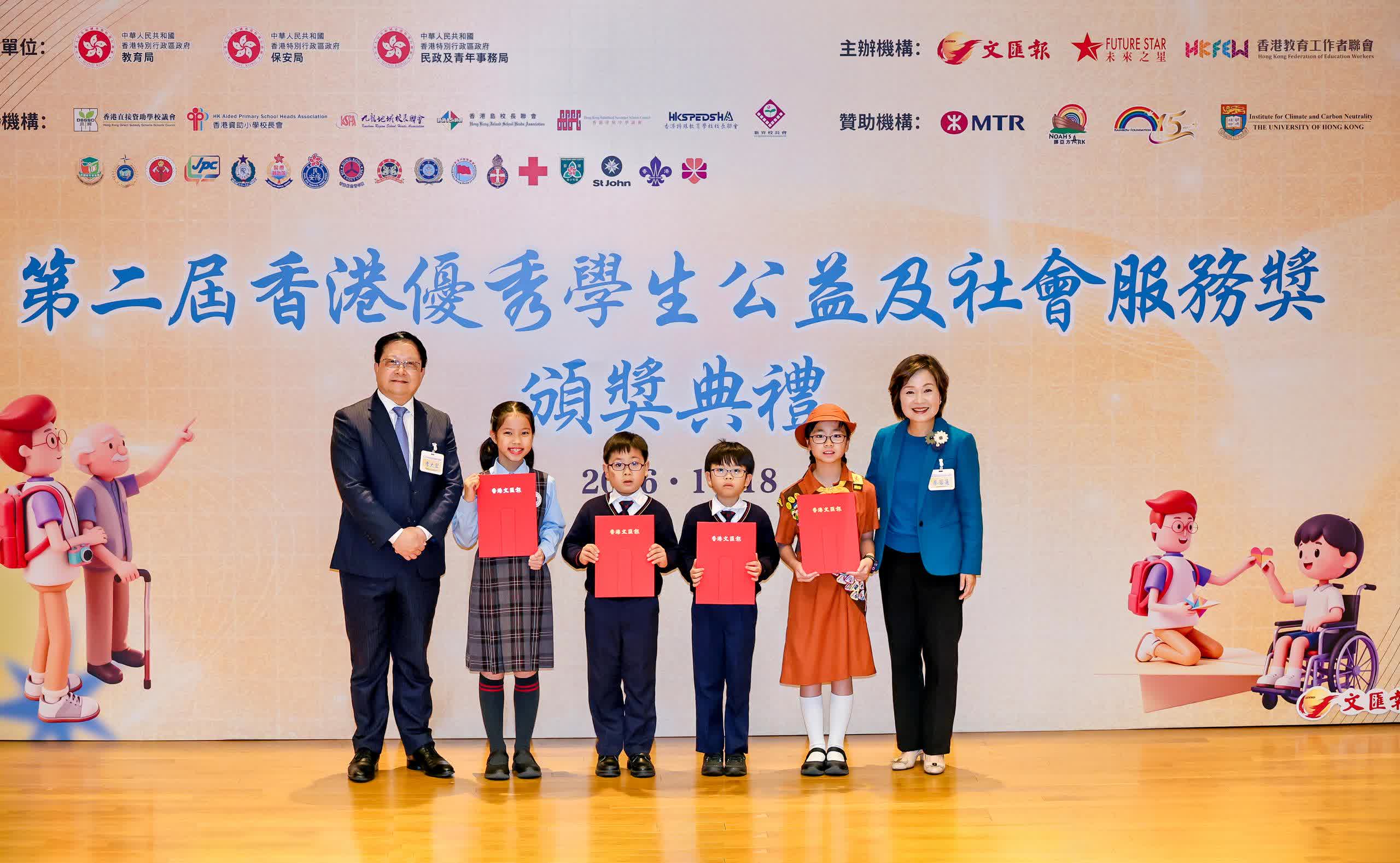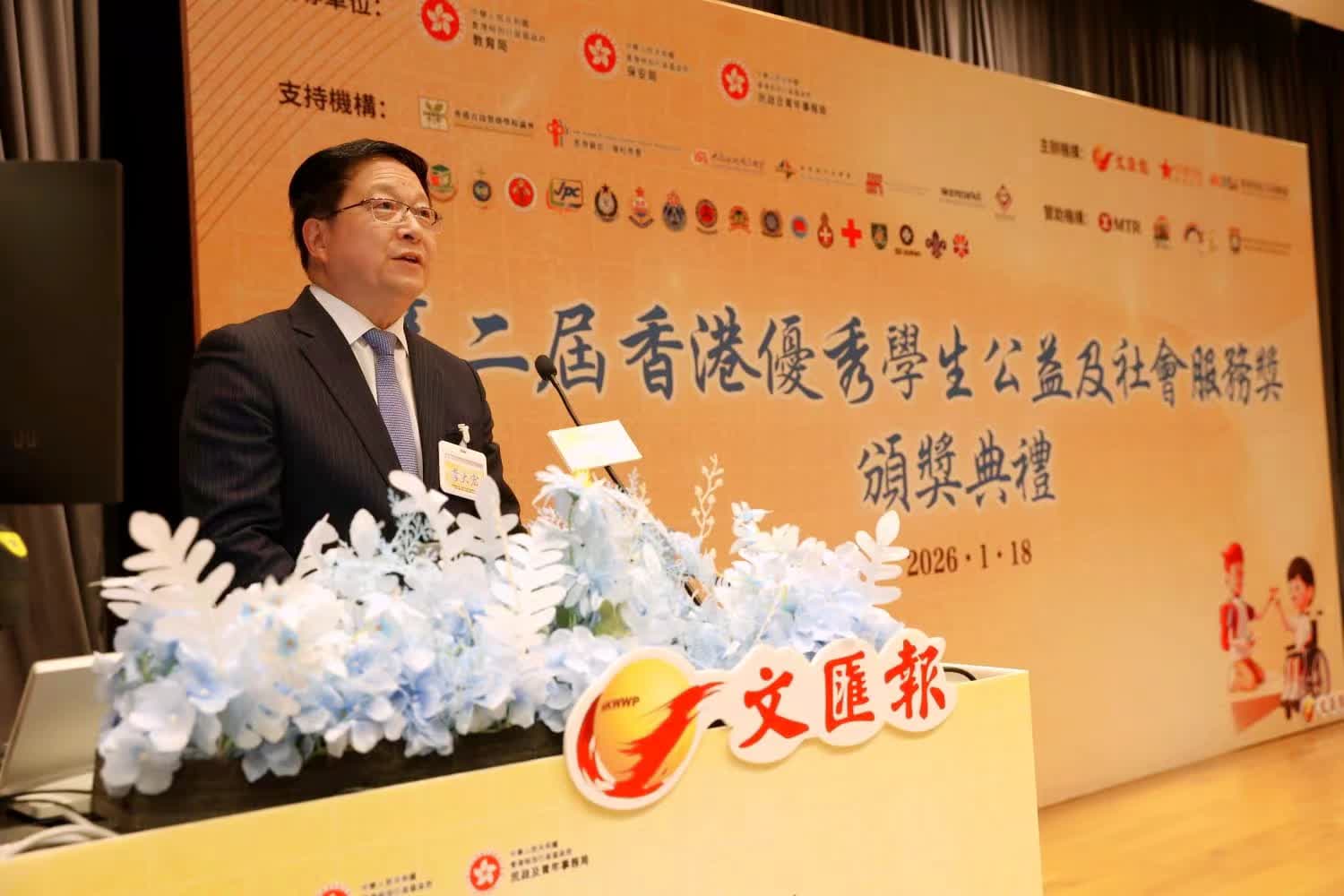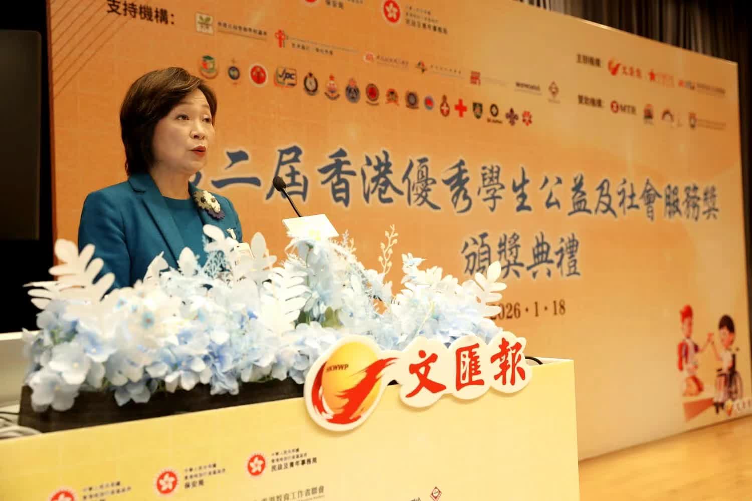 (香港文匯報記者 楊盈盈、陸雅楠)參與公益服務是香港青年全人發展、將仁愛融入日常生活、以善意推動社會溫暖的重要一環。為表揚及激勵積極參與公益服務的學生,香港文匯報與香港教育工作者聯會早前合辦第二屆「香港優秀學生公益及社會服務獎」,並於今日(18日)在香港大學舉行頒獎典禮,表彰過百名熱心服務社會、於社區傳揚大愛的學生。典禮邀得特區政府教育局局長蔡若蓮,香港大公文匯傳媒集團董事長兼文匯報社社長、大公報社社長李大宏出席主禮並致辭,約300名師生、家長與各界嘉賓歡聚一堂,共同見證這項意義深遠的教育界盛事。