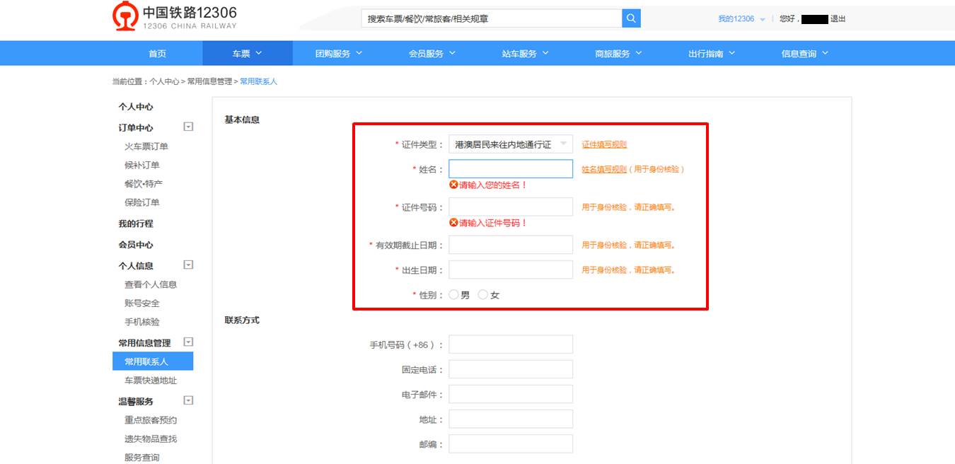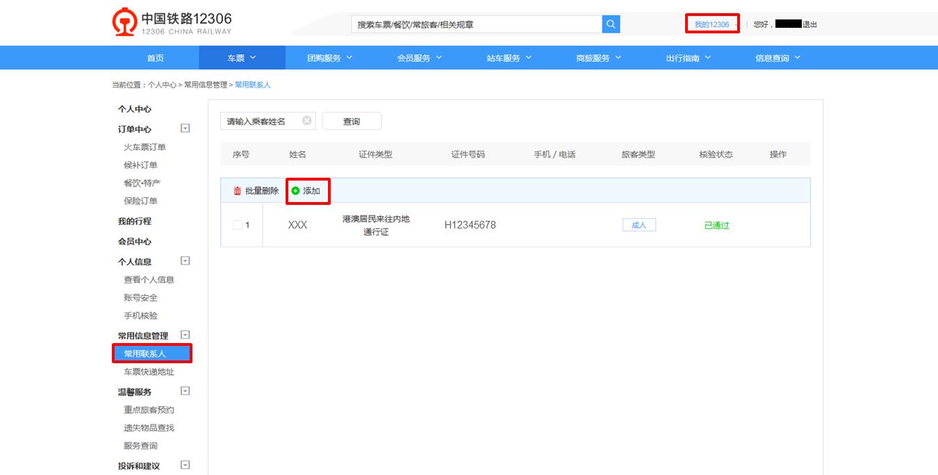 如為同行或其他旅客購票,請預先於賬戶內建立「常用聯繫人」名單。每位旅客可添加並儲存最多15位「常用聯繫人」,而「常用聯繫人」均須通過實名核驗方可進行購票。持回鄉證或台灣居民來往大陸通行證的「常用聯繫人」,實名核驗會於網上完成,結果將於添加完成後,即時顯示於賬戶之中。