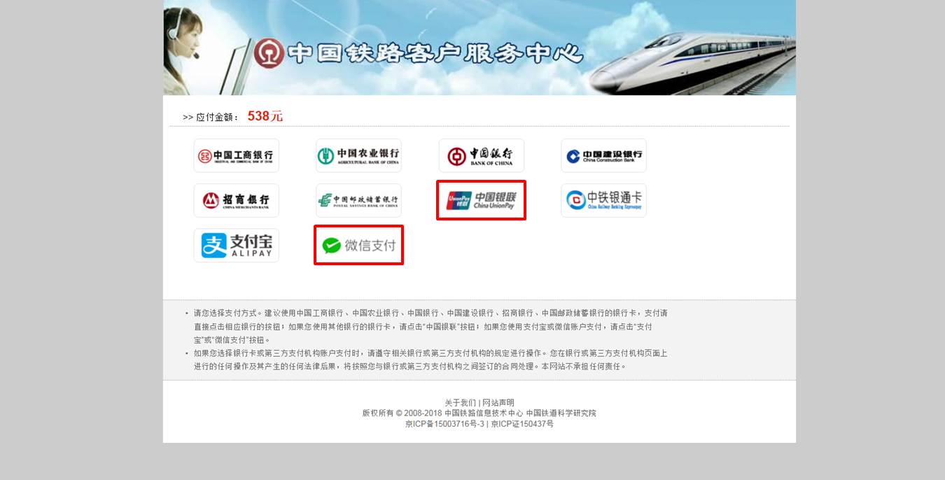 在付款頁面中,旅客須於指定時限內進行網上支付。旅客應再次核對車票資料,並自行選擇是否購買保險。完成以上步驟後點擊「網上支付」。香港及海外旅客可點選以「銀聯在線支付」或「Wechat Pay HK」支付,選擇後請按指示進行網上付款。