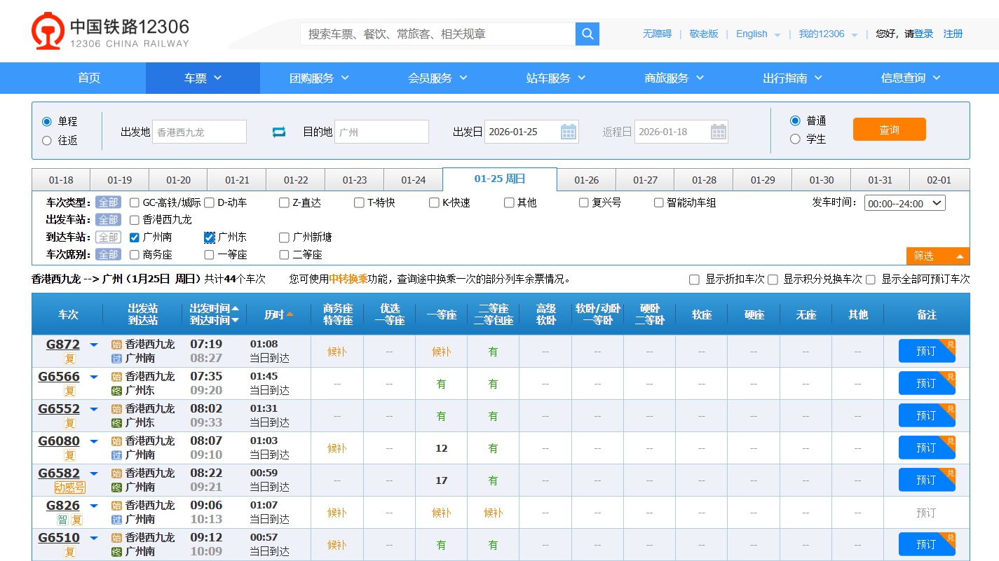 查詢結果將顯示相關的車次、出發/到達時間、車程時間及車廂等級的剩餘座位資訊。點按車次號碼及剩餘座位,將分別顯示中途站和車費。當選擇合適的車次後,點擊「預訂」。