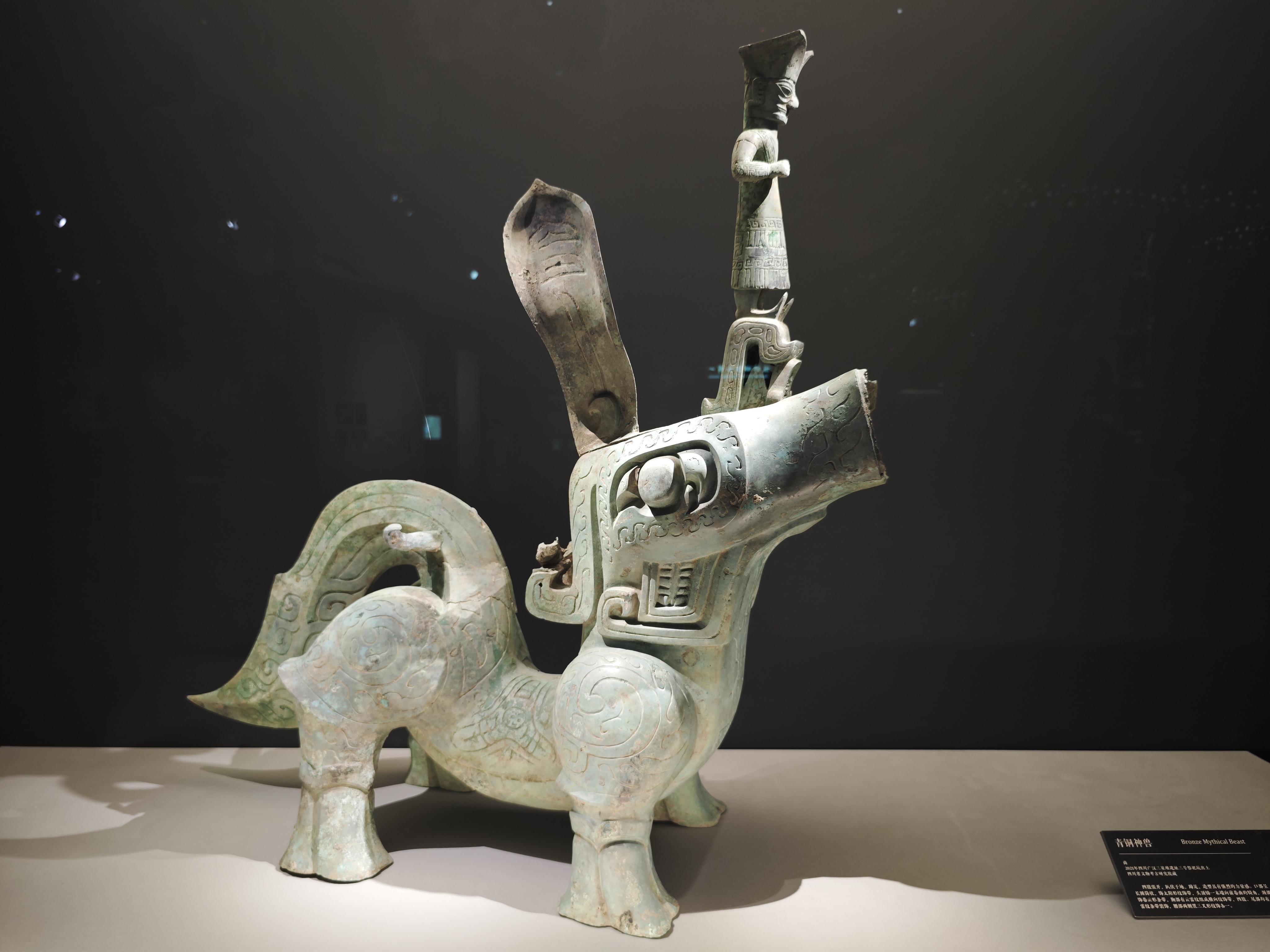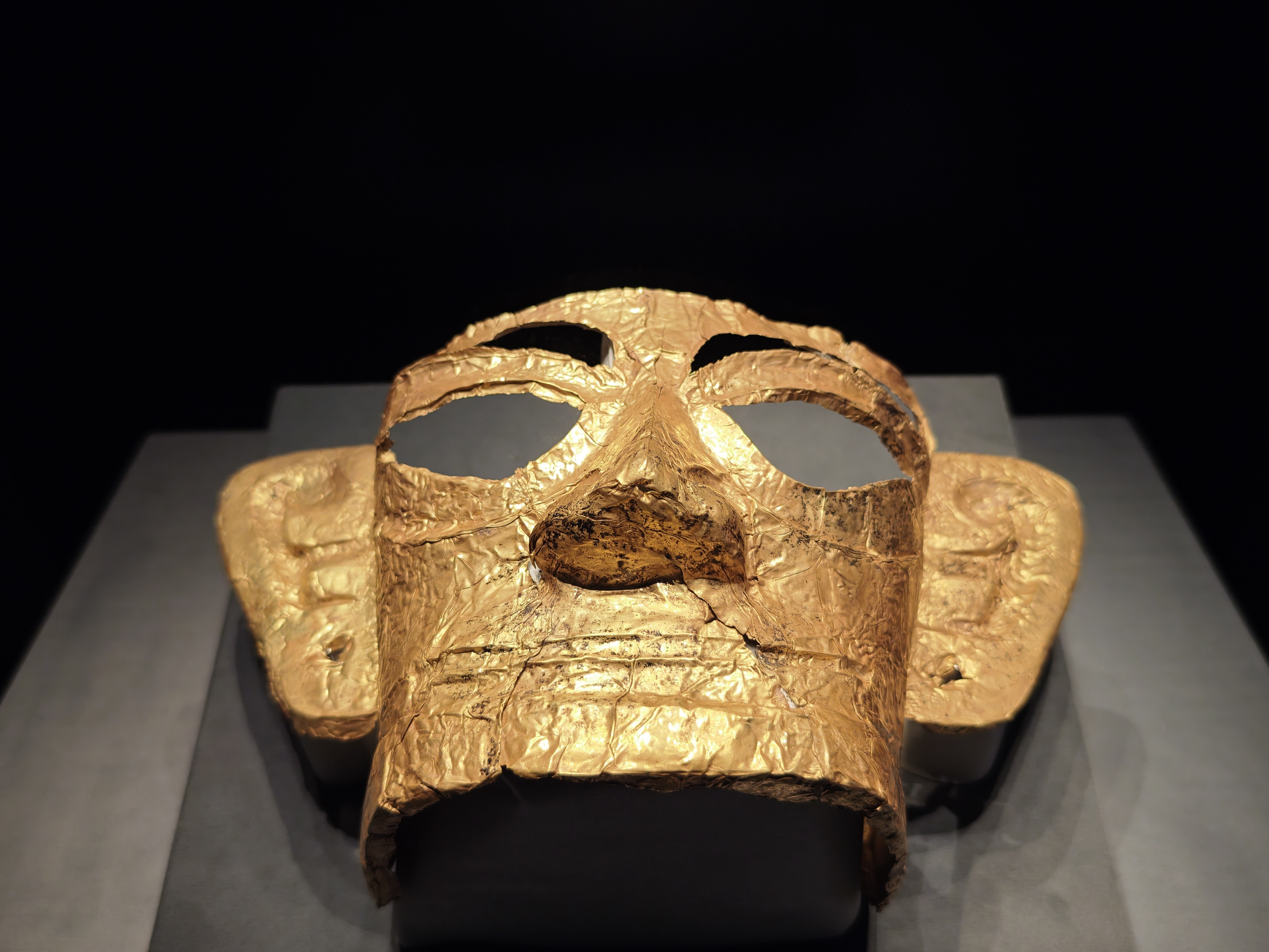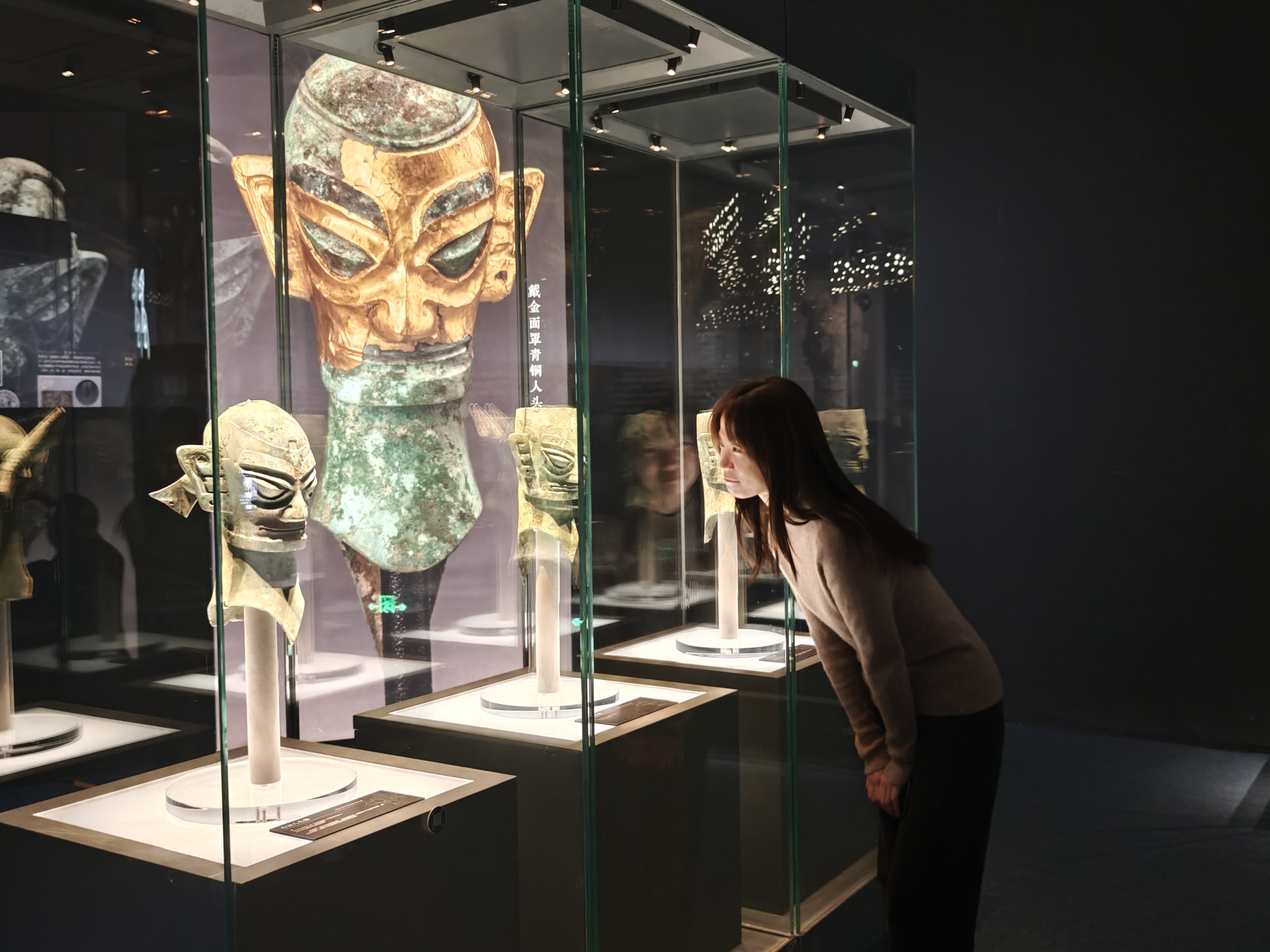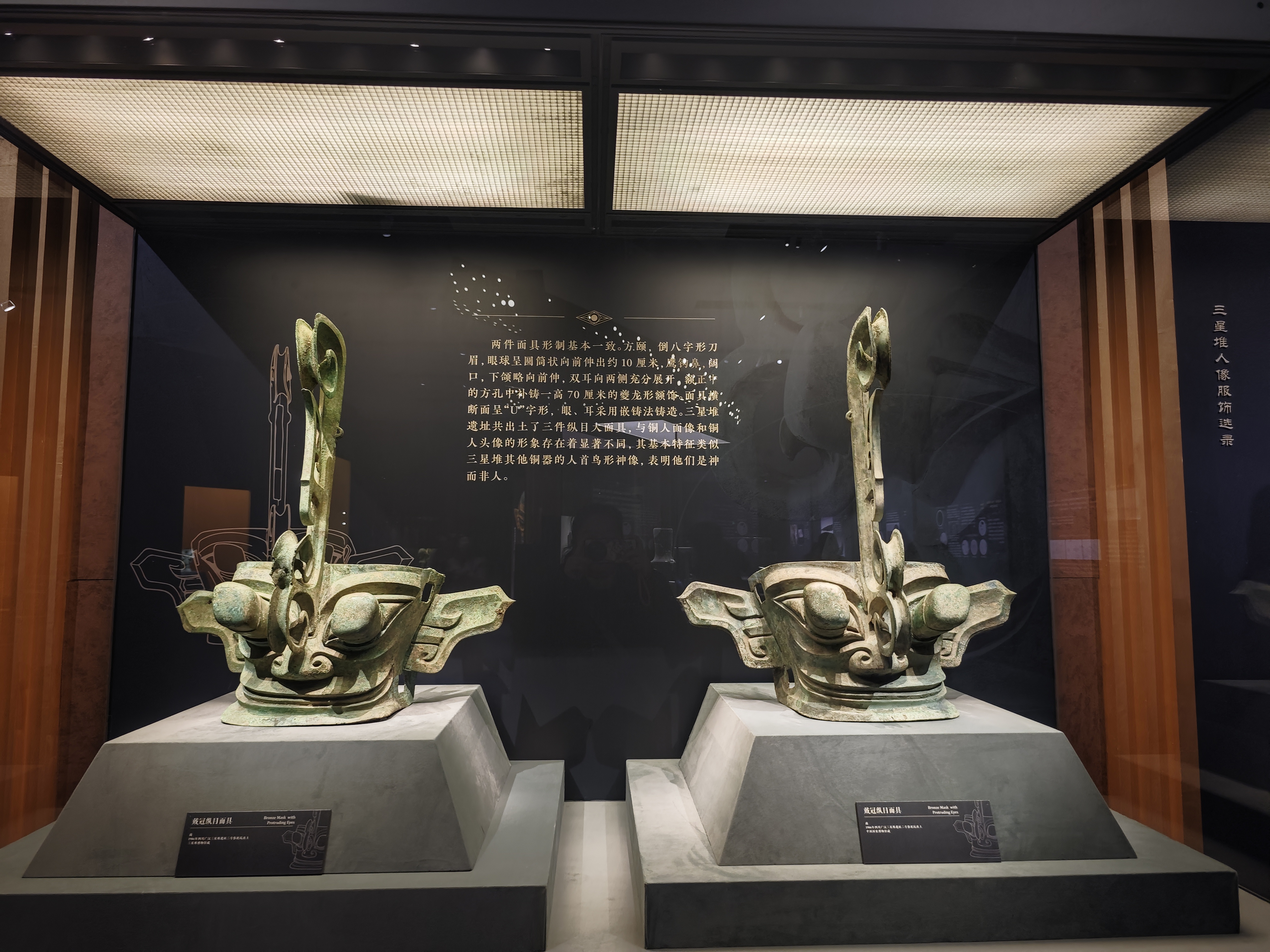 今次展覽迎來了一場歷史性聚首。三星堆博物館藏戴冠縱目面具與中國國家博物館藏戴冠縱目面具,在展廳內並列展出。這是自1986年三星堆祭祀坑發掘以來,這兩件標誌性青銅面具的首次同台亮相。