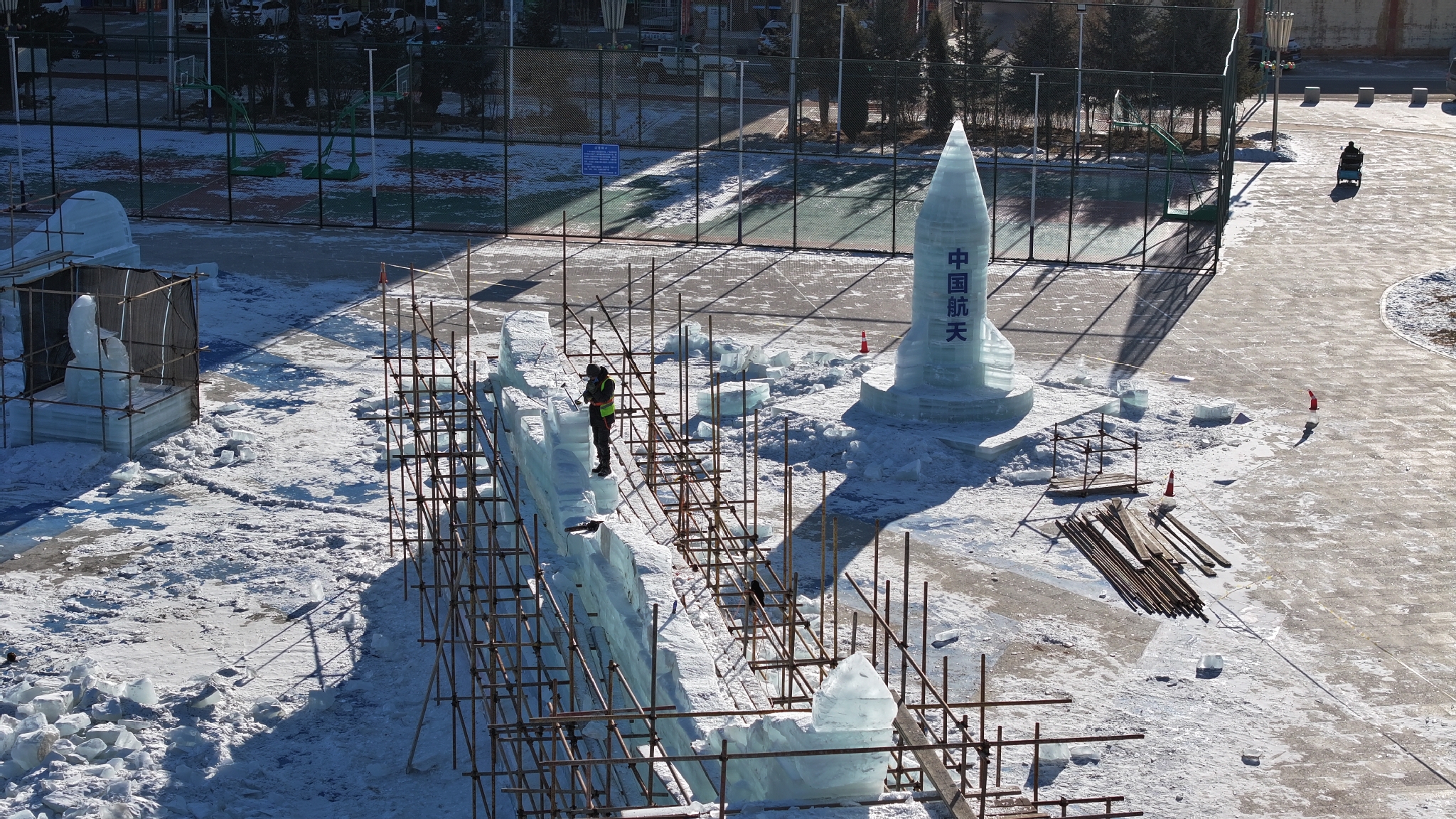 在哈薩爾廣場,以30米長、6米高的「盛世中華」冰雕為中心,搭配神舟飛船、蒙古馬、熊貓、鯉魚、哪吒、米老鼠等冰雕組合,內置流光溢彩的LED彩燈,呈現「冰晶耀星河」的夢幻場景,是遊客打卡拍照的絕佳選擇。在博物館廣場前,300個形態各異的雪人組成「雪娃參觀團」有序排列,彷彿等待着進館參觀的遊客,為冰雪那達慕增添了新的雪趣。