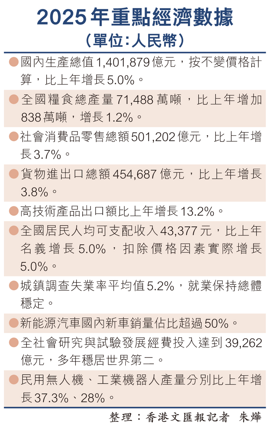(香港文匯報 記者 朱燁 北京報道)國家統計局19日發布中國經濟年度成績單,2025年國內生產總值達1,401,879億元(人民幣,下同),首次躍上140萬億元新台階,比上年增長5.0%。糧食總產量、工業、服務業、社零總額、進出口總額、居民人均可支配收入等重點指標均實現增長,2025年經濟發展向新向優,預期目標圓滿實現。國家統計局局長康義19日表示,中國經濟是一片大海,不是一個小池塘,能夠經受住風吹浪打甚至狂風驟雨的考驗。2026年是「十五五」開局之年,總體來看,機遇大於挑戰,有利條件強於不利因素。