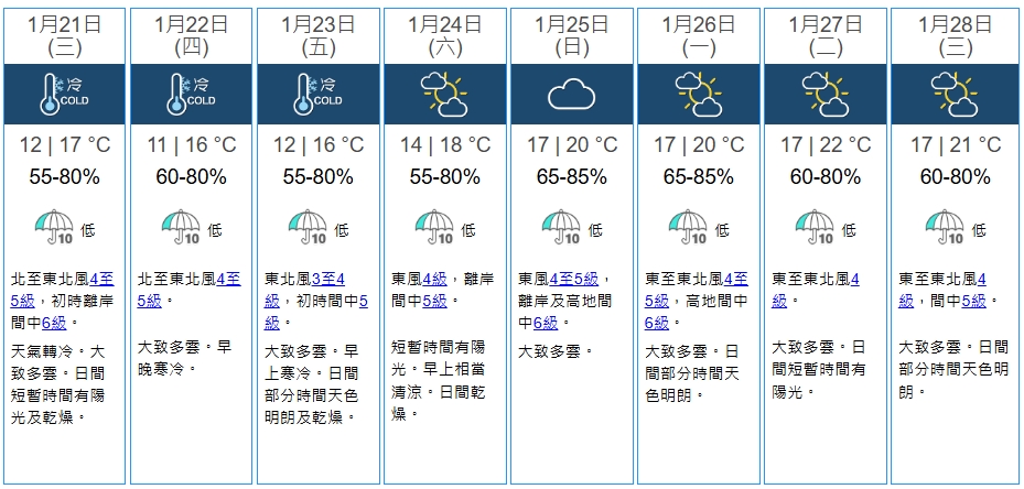 李鳳瑩指,今早一道東風影響本港,有如冬季季候風的「先頭部隊」;現時本港溫度變化不大,但晚上轉吹北風後將顯著轉冷,明日至星期五大致多雲,天氣持續寒冷,市區最低氣溫在11、12度左右,新界再低兩三度。到周末期間強烈季候風被偏東氣流取代,本港氣溫稍為回升,但早上仍然清涼。