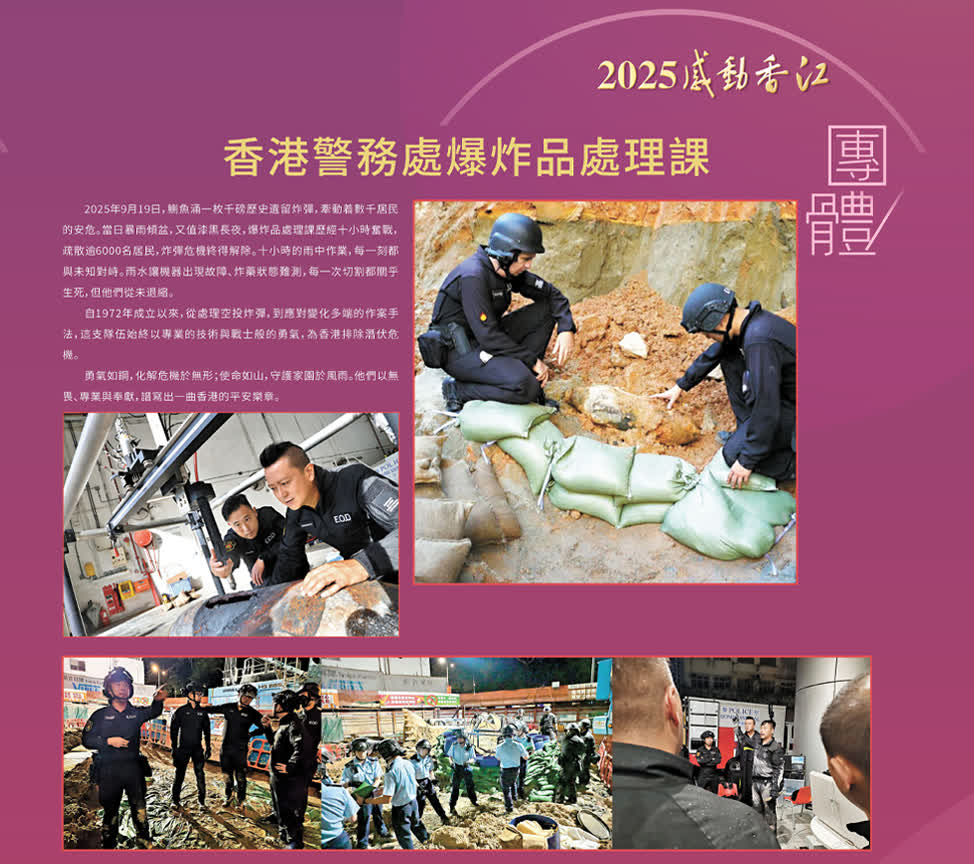 2025年9月19日,鰂魚涌一枚千磅歷史遺留炸彈,牽動着數千居民的安危。當日暴雨傾盆,又值漆黑長夜,爆炸品處理課歷經十小時奮戰,疏散逾6000居民,炸彈危機終得解除。十小時的雨中作業,每一刻都與未知對峙。雨水讓機器出現故障、炸藥狀態難測,每一次切割都關乎生死,但他們從未退縮。