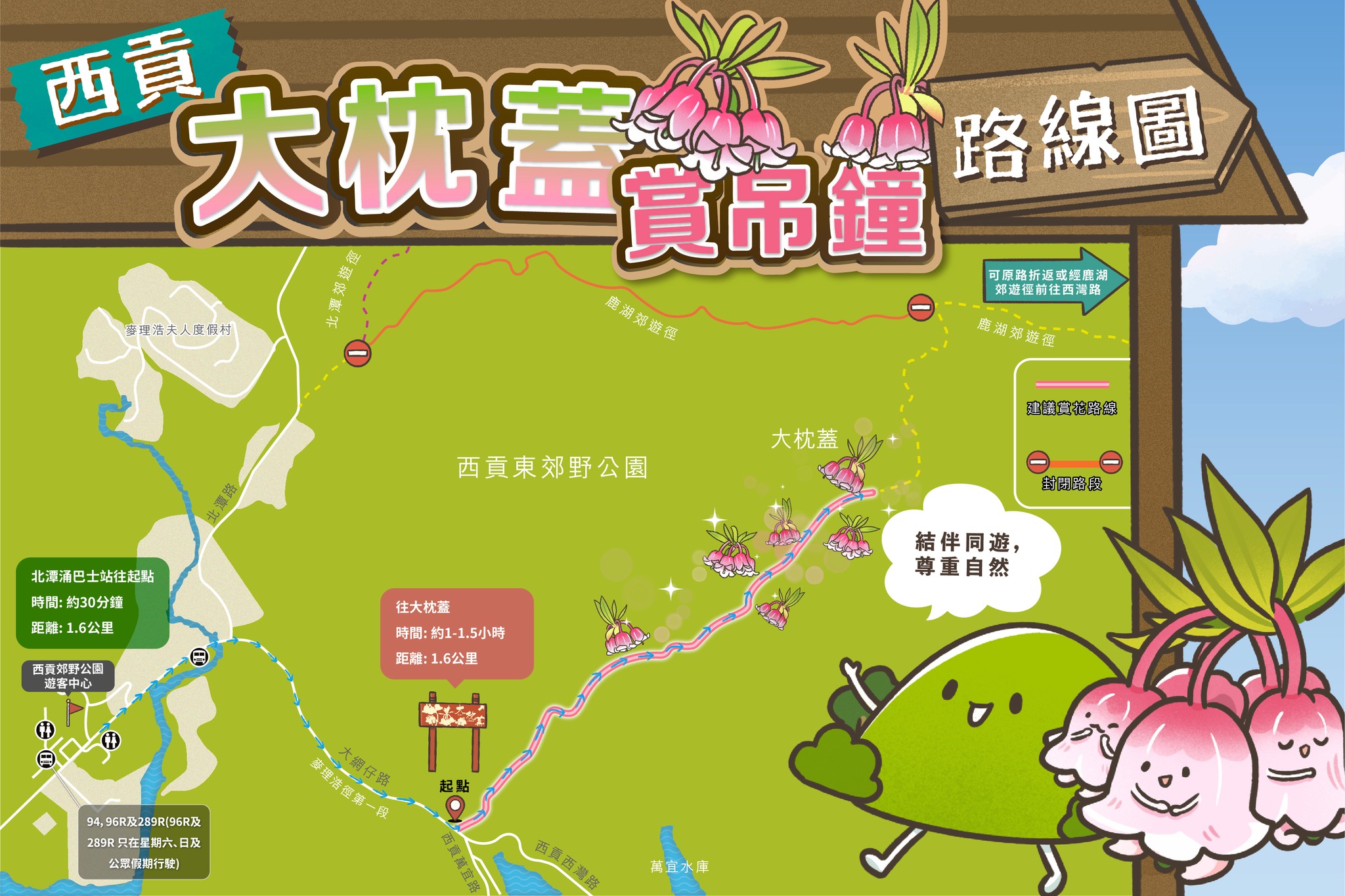 想要欣賞吊鐘花,可由北潭涌出發,沿麥理浩徑第一段行走,至迴旋處留意大枕蓋指示牌,其後上梯級開始登山。由指示牌開始,大約需要攀登1.6公里山坡,爬升約300米。該路線全程約7公里,需時約3小時(北潭涌→大枕蓋指示牌→大枕蓋山頂→鹿湖郊遊徑→鰂魚湖→大網仔路→北潭涌)。