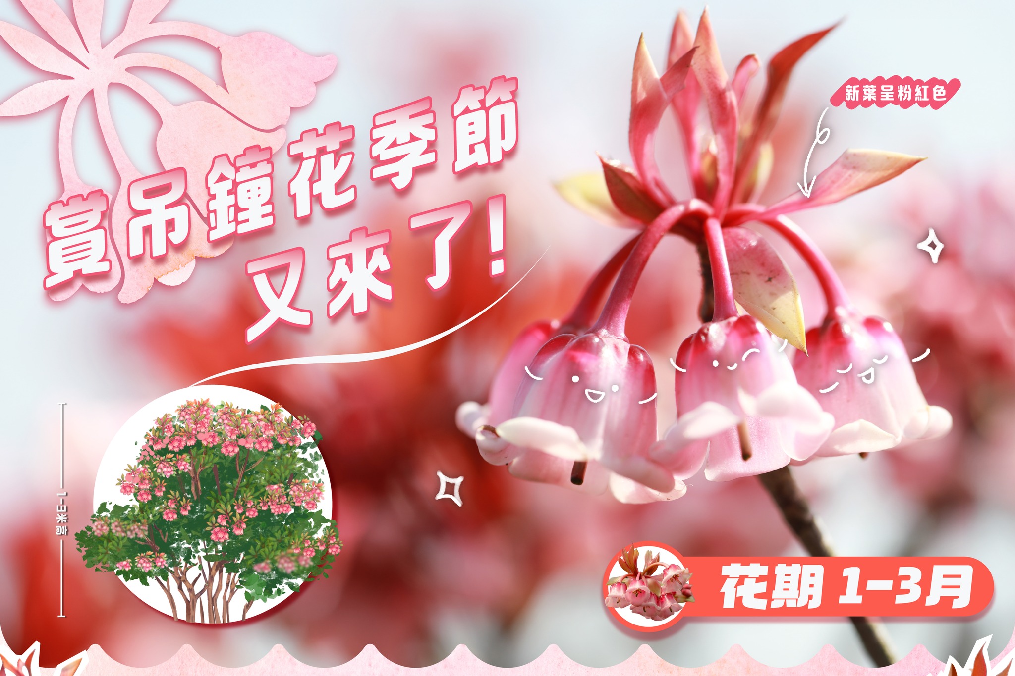 大公文匯全媒體報道,1月吊鐘花又開放~每年1月到3月,是吊鐘花的賞花季。花如其名,吊鐘花由6至8朵嬌小玲瓏的粉紅花朵組成傘形花序,一串串小鈴鐘垂掛枝頭,每年花期都吸引眾多山友專程行山拜會。