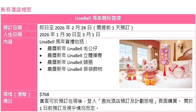 為讓節日團圓更盡興,香港居民更可專享「快樂同遊」門票預訂優惠—由2026年1月24日至5月3日,兩位或以上賓客同遊可享正價1日門票75折優惠,並獲額外餐飲及商品折扣優惠券;二人同遊可節省高達港幣470元!把握限定優惠,相約家人好友一同入園迎接馬年福氣,多人同遊加倍快樂!