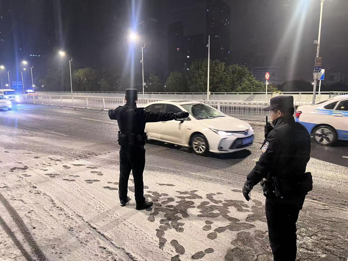 Police vehicles are on patrol on viaducts and interchanges to help traffic adjust to wet and icy roads. Officers are also providing snow clearing and emergency aid for pedestrians who slip and fall.